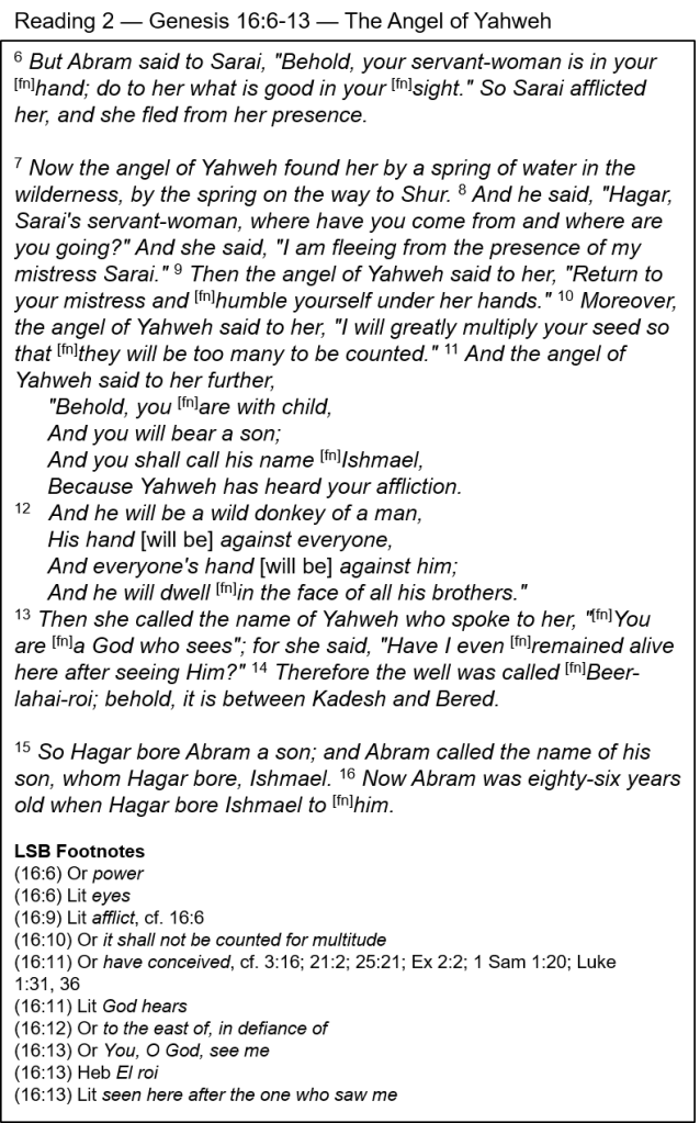 The Pre-incarnate Christ — This is the first of 56 times the expression “the angel of Yahweh” appears in the Old Testament. It is no ordinary angel (or “messenger”), but is often identified and equated with Yahweh, as we will see in subsequent passages. He showed supernatural knowledge: He called Hagar by name and named her mistress, Sarai, Abram’s wife (v. 8); He commanded her to return and submit to Sarai (v. 9); He promised a multitude of descendants from her (v. 10); He knew she was pregnant, that the baby was a male (v. 11), and that he would be independent and antagonistic (v. 12). He could be a theophany (a visible manifestation to humankind) of God Himself, but the Apostle Paul identified this “angel of Yahweh” with the Son of God, the pre-incarnate Christ, when speaking of the people of Israel who escaped from Egypt and were wandering in the wilderness: “… and all drank the same spiritual drink. For they were drinking from a spiritual rock that followed them, and the rock was Christ” (1 Cor. 10:4, cf. Ex. 17:6; Num. 20:8). The Son of God is eternal; He has always existed and He has always been active in the creation and affairs of mankind. Long before He came to earth as a baby, He was helping fearful Hagar, who was soon to give birth to a baby.