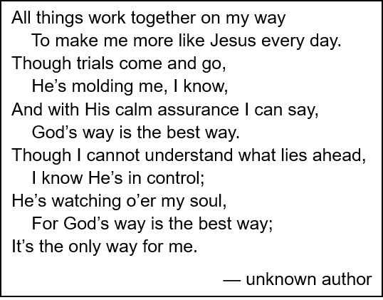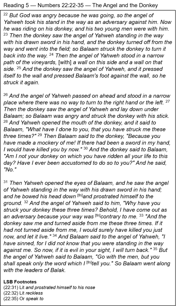 My Way — This is a very strange and unusual story that sounds like a fairy tale, but it really happened. It features “the angel of Yahweh” again, mentioned ten times in this passage. He appeared first only to the donkey and later to Balaam, which reveals His supernatural quality. He was confrontive, opposing Balaam’s way and threatening with a drawn sword (vv. 23, 31). He was challenging Balaam “because your way was contrary to me” (v. 32). Something was wrong with Balaam’s motives. Sometimes we also get stopped in our tracks, not knowing why. It would be good to ask God and ourselves the reason. Perhaps it is because we have wrong motives or that we are not willing to do what God wants us to do in His way. For Balaam, “the angel of Yahweh” warned him to “speak only the word which I tell you” (v. 35). Do it My way! When Christ came to earth, He said, “I always do the things that are pleasing to him” (John 8:29). Let’s make that our goal today as well.