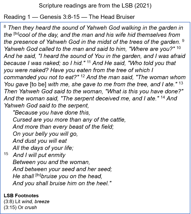 Head Over Heel — This is the first indication in the Bible of the coming Messiah, Jesus. It is a veiled prediction of the relationship between the fallen angel, Satan, and the Son of God, Jesus. In this chapter, the interaction between the serpent and Eve is to be understood on two levels. It was a natural snake in one sense as it probably curled around a branch of that forbidden tree, but it was supernatural in the sense that it could talk, reason, and question God’s commands, as can be seen earlier in the chapter. On the supernatural level, this was Satan, appearing in the form of a serpent. The Apostle John clearly identified him twice in the last book of the Bible, calling him “the serpent of old who is called the devil and Satan” (Rev. 12:9; 20:2). The prediction in Gen. 3:15 should also be seen on two levels. The “enmity between you and the woman, and between your seed and her seed” can refer to the natural fear between snakes and humans that has existed for almost everyone since the time of Adam and Eve. It must also be seen on the supernatural level since Satan does not have offspring and he lives forever. The end of verse 15 refers to Satan and Jesus, when God told the serpent, “…he [Jesus] shall bruise you on the head and you shall bruise him on the heel.” Bruising (or crushing—NIV) the head is much more serious than bruising the heel. Jesus would be physically harmed in His suffering on the cross, but Satan would be defeated and eternally crushed. This chapter gives our first peek at Jesus, the Redeemer, who “was crushed for our iniquities” (Isa. 53:5).