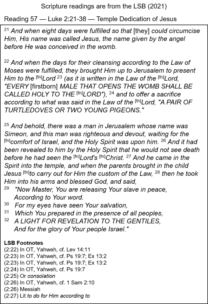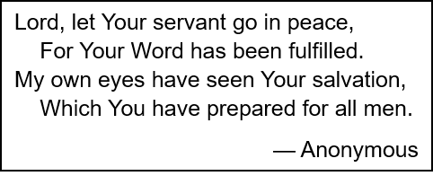 Dedicated, Recognized, and Discussed — The dedication of Jesus in the temple reveals the righteous attitudes of Joseph and Mary in their obedience to God’s Law. They did exactly as they were instructed. Like the shepherds, Simeon was another “nobody” in the story of Jesus’ infancy. He was faithfully loving and serving God, and God gave him the privilege of recognizing the promised Messiah. In the temple crowd, the Holy Spirit led him to the baby Jesus, and he prayed in gratitude, “…my eyes have seen Your salvation” (v. 30). (The name Jesus means “Yahweh saves.”) Another elderly person, Anna, encountered Jesus in the temple. Perhaps she had heard what Simeon had said about this Child. In any case, her response was to thank God and to speak about Jesus “to all those who were waiting for the redemption of Jerusalem” (v. 38). Jesus’ parents were obedient to God’s Word, Simeon was sensitive to the Spirit, and Anna was open to share about the Son. All of us should be like those ancient people.