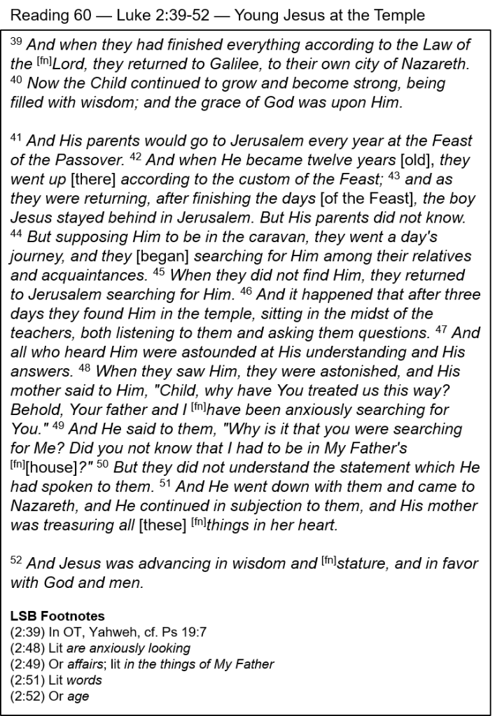 “Your father … My Father” — We find in this passage the Bible’s first recorded words of Jesus. Twelve years earlier, He was in the temple for His dedication to God as the Law required. At that time, He amazed Simeon, who was granted the privilege of recognizing the Messiah. This time, it was the teachers of the Law who “were astounded at His understanding and His answers” (v. 47). Those answers, however, were not recorded for us, so we also could be amazed. We will read about many of His words of wisdom later. When His parents found Him in the temple, Mary said, “Your father and I have been anxiously searching for You” (v. 48). “Your father” was referring to His legal father, Joseph. But Jesus turned it around in His answer to Mary: “Did you not know that I had to be in My Father’s [house]?” (v. 49; or “about My Father’s business”—NKJV). Here, “My Father” is referring to His heavenly Father. This is an indication that, by the age of 12, Jesus had the understanding that He was the Son of God, the promised Messiah. Perhaps those teachers of the Law heard Him make that identifying statement to his parents. Later, He would state this more clearly to Jewish teachers and leaders by saying, “I and the Father are one” (John 10:10), after which they picked up stones to kill Him for blaspheming, saying, “…because You, being a man, make Yourself God” (v. 33).