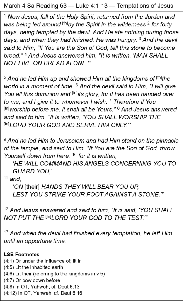 If You Are … — In two of these three temptations, the devil introduced his demands with the challenge, “If You are the Son of God …” (vv. 3, 9). Satan used something that was true to try to tempt Jesus to do something that was wrong. He does the same sort of thing to us today, like, “If you are saved, why should you be concerned about enjoying sin once in a while?” Jesus’ first temptation had to do with satisfying one’s personal needs of comfort. Jesus had been in a desert area without food for 40 days. He was suffering. “If You are the Son of God, why are you in this predicament?” Does that sound familiar? “If I am a Christian, why don’t I have enough money … a better job … a harmonious family, etc.?” The temptation offered to Jesus was to change stones into bread in order to satisfy His hunger. He could have done it even before the devil tempted Him, but He “was being led … by the Spirit” (v. 1). The Spirit was His guide and the source of His supply, so Jesus was depending on and waiting for God’s will. The last temptation was to put God to the test, which was forbidden in Deuteronomy 6:16. It might include trying to force God to keep some part of a promise that He has made in Scripture. His promises are true, but His timing may not be the same as ours. Maybe our 40 days of suffering have not yet been completed. In the meantime, we should continue to be led by the Spirit and trust in God.