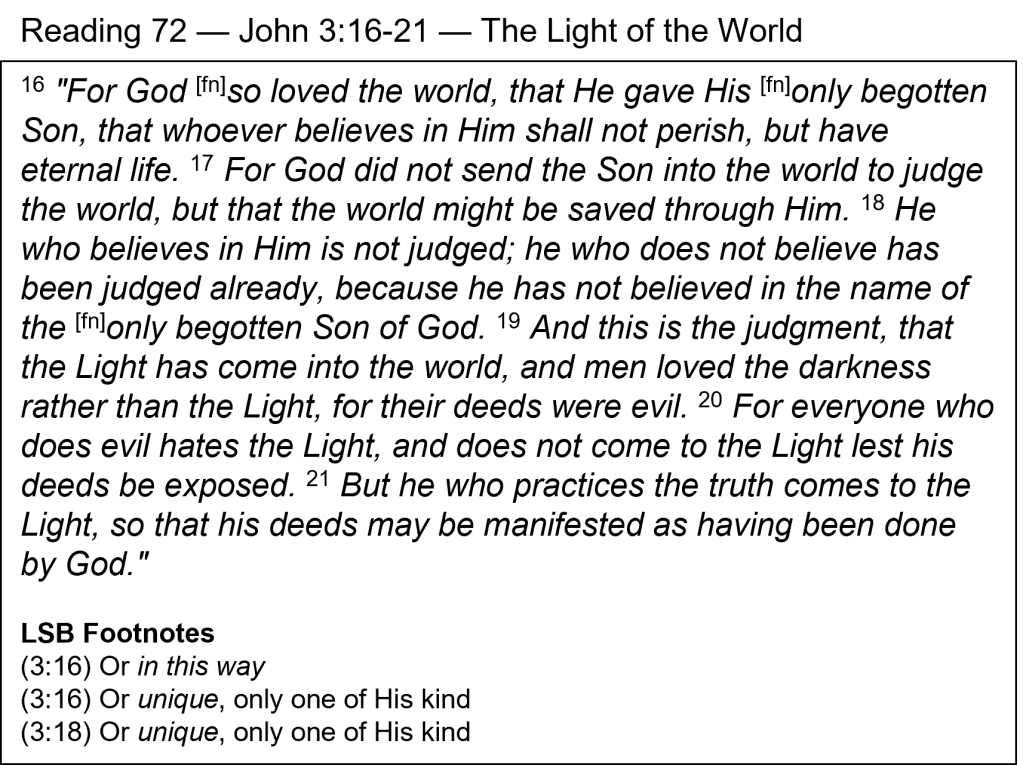 Son, Savior, Light — Probably the most famous verse in the Bible shows the first of three titles, or characteristics, of Jesus — the “only begotten Son” (v. 16). The LSB footnote on the word translated “only begotten” (“or unique, only one of His kind”) is very important. The Greek word is used nine times in the NT, five of them about Jesus. Its key use for our understanding of it is in Hebrews 11:17, where it says that Abraham, in his willingness to offer Isaac as a sacrifice, was “offering up his only son.” There, the same word is translated “only,” although Abraham had a previous son, Ishmael. Isaac was his “unique” son, one of a kind, because he was the son that God had promised, not the one Sarah had arranged through a substitute wife, Hagar. So, the Son of God was not “born” of God the Father as we think of procreation; He was unique. The second title of Jesus is the suggested word, Savior, which indicates the purpose for His coming to earth: He came “that the world might be saved through Him” (v. 17). The Father sent the Son so that we might be saved. The name Jesus, itself, means “Yahweh saves.” The third title, Light, speaks of the character of the Son: “the Light has come into the world” (v. 19a). The Light exposes in two ways. Negatively, it exposes the evil deeds of humans (v. 19b), so that many of them flee from the Light. Positively, it exposes the fact that the good deeds of believers are those “having been done by God” (v. 21). We walk in the Light.