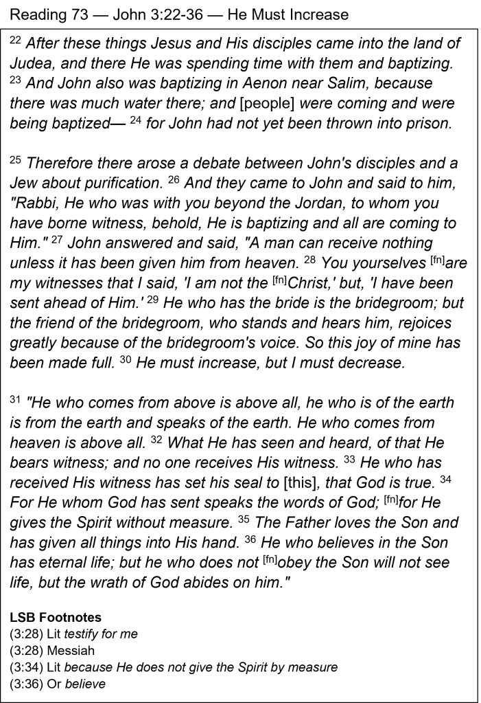 He is Above All — The final paragraph in this chapter is filled with information about Jesus. Twice in the same verse, it mentions that He is “from above … [or] from heaven” and “is above all” (v. 31). That speaks of both His source and His standing — His divinity and His dominion. He is part of the Trinity, all three of which we see in this passage: God the Father sent the Son, loves the Son, and gave the Holy Spirit to the Son (vv. 34-35). What the Son gives to us is “His witness” (v. 33), which is “the words of God” (v. 34), and to those who believe in Him, He gives, “eternal life” (v. 36). As Paul summarized later, “Christ is all and in all” (Col. 3:11). What a wonderful privilege we have, that the Creator and Ruler of the universe dwells within our hearts because we have believed in Him! We are blessed to begin to share in this life, a foretaste of the “eternal life” that will last forever.