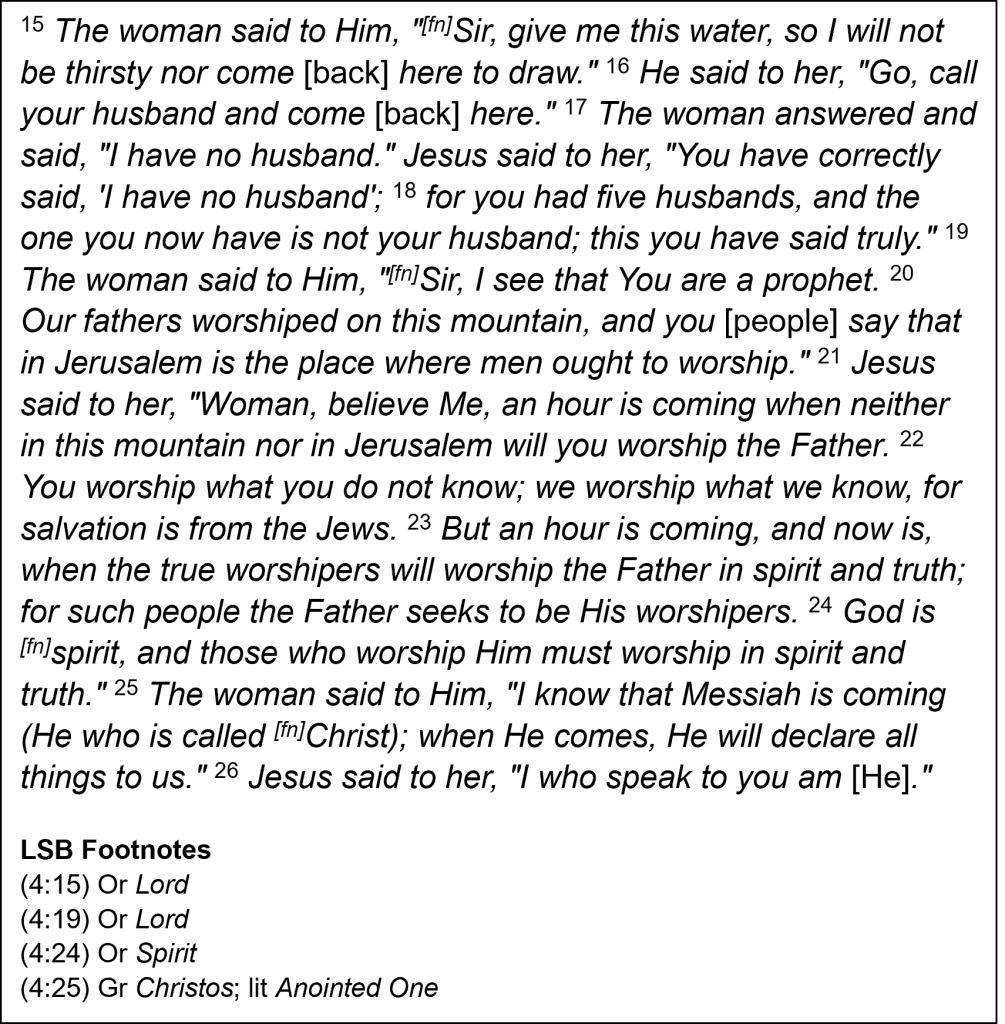 “I Am He” — Many characteristics of Jesus are revealed in this passage. First, He was led by the Father: He “had to pass through Samaria” (v. 4). It was more than a geographical necessity. Next, He was fully human: He was “wearied from His journey” (v. 6). Being also divine did not remove the weakness of His flesh. He was also socially daring by speaking to a Samaritan woman (v. 9), breaking racial, religious, and gender boundaries to communicate truth to an open, needy heart. He was not governed by the manmade rules of culture. Then, we see that He was omniscient, knowing that this woman “had five husbands, and the one you now have is not your husband” (v. 18). He was prophetic, as she acknowledged (“I see that You are a prophet”—vs. 19), and as He demonstrated in His two statements introduced by “an hour is coming…” (vv. 21, 23). Finally, He was revealing, identifying Himself as the Messiah (“I who speak to you am He”—v. 26). This was a rare, direct acknowledgement from Jesus, probably always avoiding the strong Jewish expectation of the Messiah coming as a political and military leader. Later, He even “warned the disciples that they should tell no one that He was the Christ” (Matt. 16:20). All of that changed after Jesus’ resurrection, when He charged His disciples to “make disciples of all the nations … teaching them to keep all that I commanded you…” (Matt. 28:19-20). That is our commission as well; we are commanded to be a part of sharing Jesus with others, even supporting those who take the message to other areas in our world where people do not know about Jesus.
