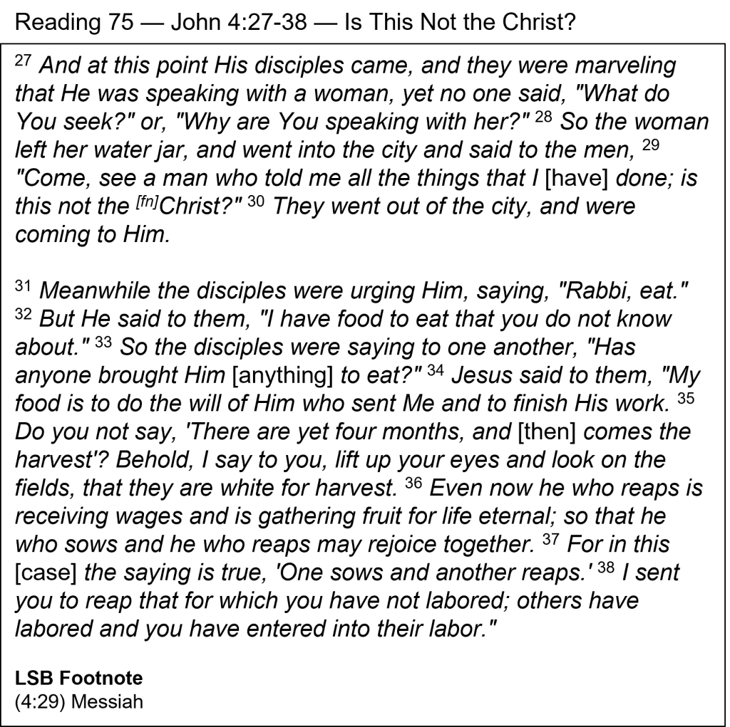 The Satisfied Master — Two characteristics of Jesus stood out to me as I read this passage. One was His commanding presence. He was so far above His disciples that it seems they were a little afraid of Him. Although they had questions about Jesus’ actions, “yet no one said…” (v. 27). Later, when Jesus refused the food they had brought, they avoided asking Him their questions, and instead, they “were saying to one another…” (v. 33). Jesus was their friend, but He was also their Master. They respected Him and were hesitant to question Him. Part of their caution was probably that He sometimes answered their questions in a way that they didn’t quite understand. He often talked about something physical that carried a spiritual meaning, which is the second characteristic of Jesus that I saw here. The disciples were speaking of physical food, but Jesus was talking about the spiritual food of doing “the will of Him who sent Me” (v. 34). His encounter with the Samaritan woman and His knowledge that others were coming to Him because of her testimony was providing a deep satisfaction that temporarily took away His desire for physical food. Is doing the will of God as satisfying to us as eating a regular meal?