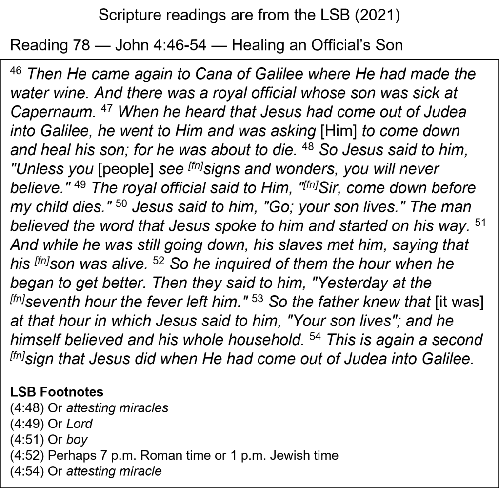 Healing at a Distance — The news of miraculous things Jesus had done in Jerusalem at the Feast was spread not only among the Jews in Galilee, but also to Gentiles. The “royal official” (v. 46) was a Gentile in a high governmental position who lived in Capernaum on the northern coast of the Sea of Galilee, over 16 miles (27 km) from Cana. Twice, the official asked Jesus to “come” (vv. 47, 49) to Capernaum, but He didn’t need to go there. He had the power to heal at a distance, so He simply told the royal official, “Go…” (v. 50). The miracle was instantaneously done, and the boy was healed (“…your son lives”—v. 50). Jesus made a statement to the official that He repeated many times in future situations, that “Unless you [people] see signs and wonders, you will never believe“(v. 48, both “you” pronouns are plural). Most people had a show-me-first attitude. This Gentile official, however, “believed the word that Jesus spoke to him and started on his way” (v. 50). He believed before he saw the evidence. His faith was strengthened even more, however, after he heard the report from his servants that his son was restored: “he himself believed and his whole household” (v. 53). His faith spread to his family after he arrived at home. He had believed that Jesus could heal his son, which is why he went to Him. What he discovered, however, was that Jesus was even more powerful than he thought; He healed at a distance!