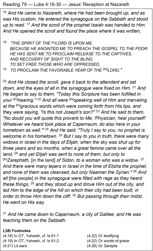 From Marveling to Murdering — After Jesus claimed to be the fulfilment of the Messianic prophecy in Isaiah, the people “were speaking well of Him and marveling at the gracious words…” (v. 22a). That sounds good, but their next comment was a question: “Is this not Joseph’s son?” (v. 22b). That was a question of doubt; it was like asking, “How could someone we know claim to be the Messiah?” Jesus recognized their doubt, and He also knew something else about their superficial marveling: they were highly prejudiced against Gentiles. So, Jesus took two examples from Israel’s prophets, Elijah and Elisha. When Israel was plagued by famine, God sent Elijah to a Gentile widow who would care for him (v. 26). Although there were many unhealed lepers in Israel, God sent a leprous Gentile general to Elisha for healing (v. 27). At this point of Jesus’ comments, the people “were filled with rage” (v. 28) and the marvellers became murderers. Jesus knew their hearts and He exposed them. When they tried to kill Him, Jesus produced a miracle by somehow “passing through their midst…” (v. 30). Jesus was a proclaimer of truth, even when it hurt.