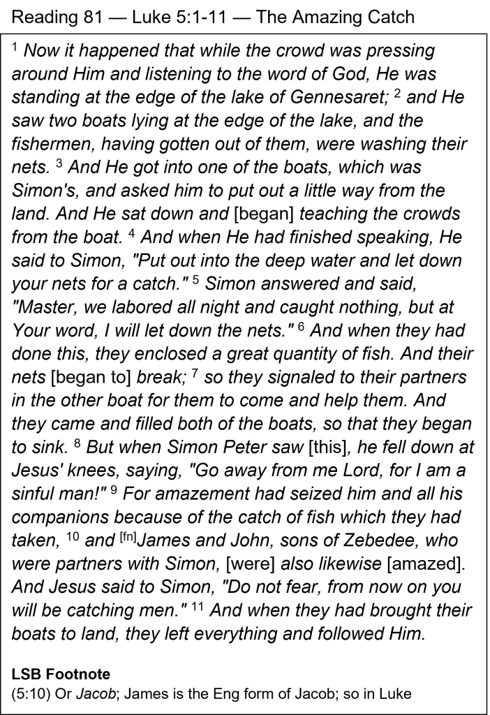 Divine Words and Power — Jesus was a great teacher, as evidenced by the great crowds that followed Him. He had to get into a boat to distance Himself from the press of the people. Why was His teaching so great? It was because He was teaching them “the word of God” (v. 1)—divine words. Then, after He finished teaching, He demonstrated His divine power, which also involved His divine knowledge. He didn’t tell Peter to go to a particular spot where He knew the fish were located; He very generally told him to go “into the deep water” (v. 4). He had the fish come to where Peter decided to let down the net. That is supernatural knowledge and power. Jesus was not only Master of the crowds of people, but also of the schools of fish. The result was that Peter, James, and John were filled with “amazement” (v. 9). They knew they were in the presence of God, which is why Peter fell on his knees in a boat full of fish to declare, “I am a sinful man!” (v. 8). The closer we are to God, the more we are aware of our sinfulness. The fishermen’s response was to surrender to Jesus: “they left everything and followed Him” (v. 11).