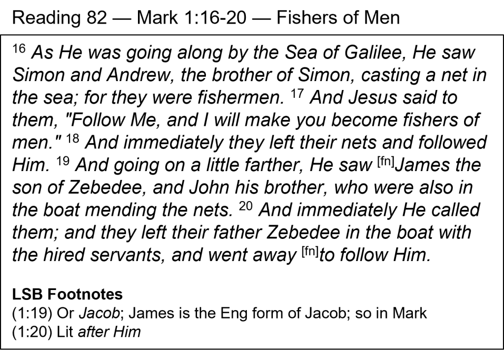 Becoming Fishers — Was this calling of disciples simply Mark’s rendition of the same event that we read about yesterday in Luke? There are several differences. Andrew was not mentioned in Luke’s account (cf. Mark 1:16). Luke wrote that Peter was washing nets (Luke 5:2), while Mark said they were casting a net (Mark 1:16). In Luke 5:10, Jesus said only to Peter, “from now on you [singular] will be catching men,” but in Mark 1:17, Jesus said to both Peter and Andrew, “Follow Me, and I will make you [plural] become fishers of men.” If these were two events, why would they leave their fishing twice to follow Jesus? We might not have enough information in these two accounts to properly decide. Three parts of Jesus’ call in Mark’s account interested me. The first was the initial responsibility of the disciples (“Follow Me”): they had to follow Jesus. That involved a deep decision for these disciples; it was an act of courage to abandon their vocation. They were leaving their source of income. The second important part was that it was Jesus’ responsibility to bring them to the point of becoming “fishers of men.” He is the source of power and change. Disciples follow but Jesus changes. The final part is that “…make you become…” implies a process. Jesus lived with them, taught them, and gave them an example over a period of three years before they were thrust out into ministry after Jesus’ resurrection. How is your “fishing” coming along? Are you disappointed in the results of your attempts to influence others toward Christ? Don’t forget that you are still “becoming.” Keep fishing!