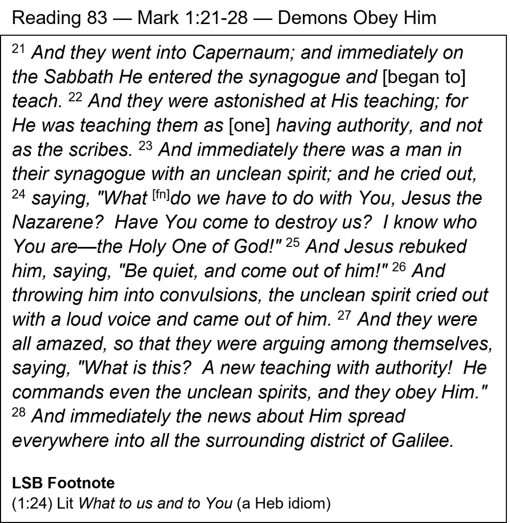 Astonished and Amazed — There are two reactions of the people in the synagogue regarding what they saw during Jesus’ visit. The first was astonishment: “And they were astonished at His teaching” (v. 22). The Greek word for “astonished” is used 13 times in the New Testament, and 11 of them involve reactions of people about Jesus. Here, the crowd was struck by His teaching because of the authority with which He taught. The people were used to teachers quoting earlier, prominent rabbis regarding what they had said about certain Scripture passages. Jesus only told them what He thought because He was God, the source of the Scriptures. He spoke more like a prophet than a priest. That should alert us to the importance of spending time meditating on passages we read in the Bible, asking God to teach us with His insights. The second reaction of those synagogue people was that of amazement: “And they were all amazed …” (v. 27a). What amazed them in addition to His teaching? It was His control over the demons: “He commands even the unclean spirits, and they obey Him” (v. 27b). Why did they obey Him? It wasn’t because of His higher rank—they had already rebelled against God in disobedience. It seems that they were afraid of Jesus’ power. This demon, representing the whole body of rebellious demons, asked, “Have You come to destroy us?” (v. 24). They knew that their rebellion against God was going to end in eternal punishment, but they didn’t know when. This demon obeyed out of fear that his punishment would begin then. Astonishing teaching and amazing power—let us wonder together at Jesus’ greatness!