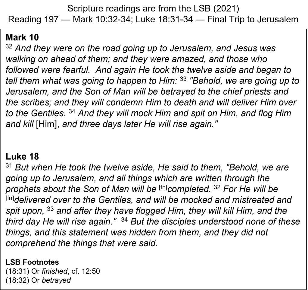 Christ’s Sacrificial Purpose — This is the third time it is recorded that Jesus told His disciples about His coming death. The fact that at one of those times Peter took Him aside to rebuke Him, shows that they understood the basic meaning of His words (Mark 8:32). Later, when they were going to Bethany to raise Lazarus from the dead, Thomas replied, “Let us also go, so that we may die with Him” (John 11:16). They understood that He was going to die. What apparently confused them was that this talk of death conflicted with their own anticipation of a conquering, ruling Messiah. God had hidden His sacrificing purpose from them until Jesus rose from the dead. When His disciples saw the determination of Jesus as He “was walking on ahead of them” (Mark 10:32a) to Jerusalem, “they were amazed, and those who followed were fearful” (v. 32b). Why would He walk toward danger with such resolve? They probably also feared for themselves that they might share in the troubles awaiting Jesus. We read earlier about the Suffering Servant who said, “Even now Lord Yahweh helps Me … Therefore, I have set My face like a flint” (Isa. 50:7). Jesus knew His sacrificial purpose, yet He faced it willingly and with determination. The cross was not a dreadful end; it was God’s predicted solution for the penalty for sin.