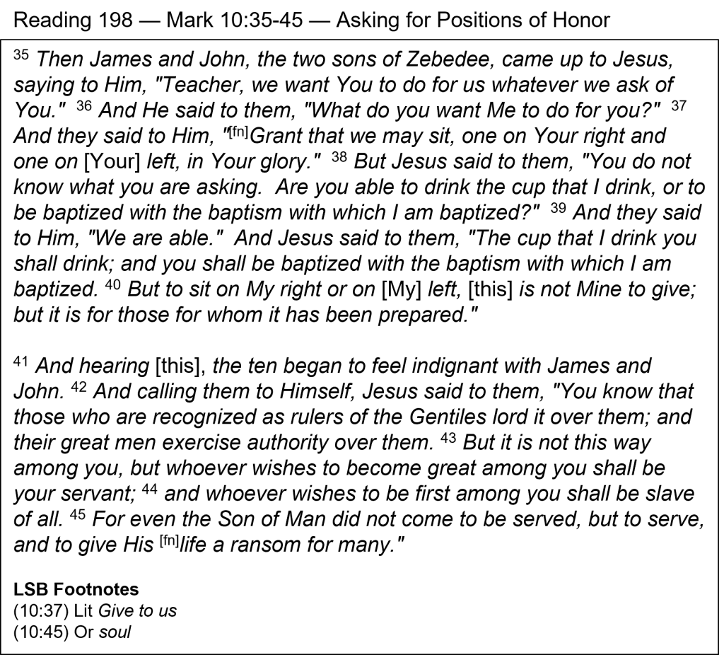 Selfishness or Service — All of the Twelve showed selfishness in this story. Although James and John belonged to Jesus’ inner circle (along with Peter), they wanted more—to go from a trio to a duo. This is another example of unfulfilled striving for greatness; it never satisfies, but always wants more. The other ten disciples then showed their selfishness by being indignant with James and John, probably out of their own desire and jealousy. Jesus took this exchange as an opportunity to teach an important lesson about honor and glory, which should come only through humble and loving service. Our sinful human tendency is to rule over others, but God’s way for us is to serve others. Jesus offered Himself as the supreme example: “The Son of Man did not come to be served, but to serve and to give His life a ransom for many” (v. 45). We all like to be served, but that was not Jesus’ purpose for coming. He came “to serve and to give…” Serving others involves giving to others. Jesus gave the ultimate human gift—His life. Serving involves unselfish sacrifice.
