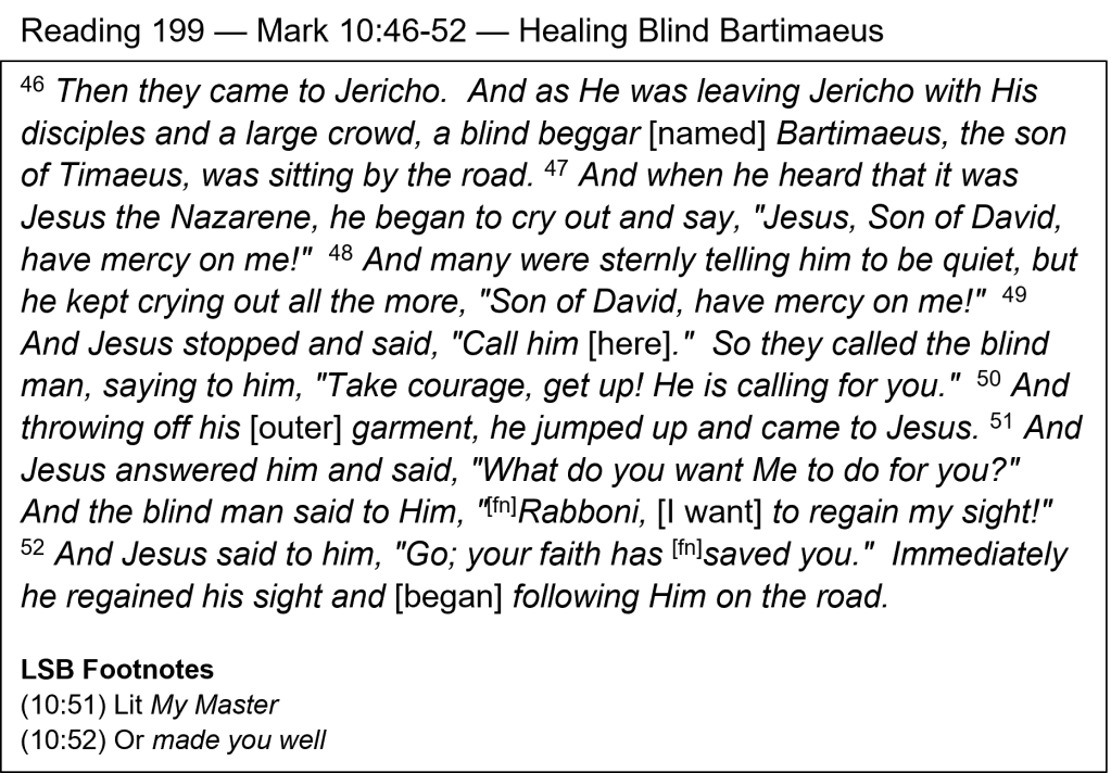 From Beggar to Disciple — Jesus was on His way to Jerusalem to die, yet He stopped to show compassion toward this blind man. The crowd with Him didn’t have compassion but told Bartimaeus to be quiet. They thought he was too insignificant to bother Jesus. That is the same kind of attitude the Twelve had about children being brought for Jesus to touch them (Mark 10:13-16). The needy one was too insignificant and the Savior was too important. The statement that Bartimaeus “heard that it was Jesus the Nazarene” (v. 47), reveals how widely Jesus’ reputation of power and compassion had spread. The blind man knew Jesus’ name and that He was from Nazareth. He also believed that Jesus was the Messiah, calling Him “Son of David” (v. 47), the lineage through which the Messiah would come. Bartimaeus also showed great persistence and faith. When the crowd told him to be quiet, “he kept crying out all the more” (v. 48). He knew what he wanted, and he believed that Jesus was the solution to his problem. Then Jesus stopped at his cry for mercy. Merciful Savior! Jesus has time and concern for us as well. Keep crying out with persistence and faith! When Bartimaeus heard that Jesus was calling for him, he threw off his outer garment as he got up. Something more important than a robe was now involved. Giving him an opportunity to express his faith, Jesus asked him what he wanted. What he wanted was obvious, but he needed to express it, which he did, calling Jesus “Rabboni,” the Hebrew word meaning “my lord” or “my master” or “my teacher.” He was now committed to Jesus “and began following Him on the road” (v. 52). He went from a blind beggar to a physically and spiritually enlightened disciple.
