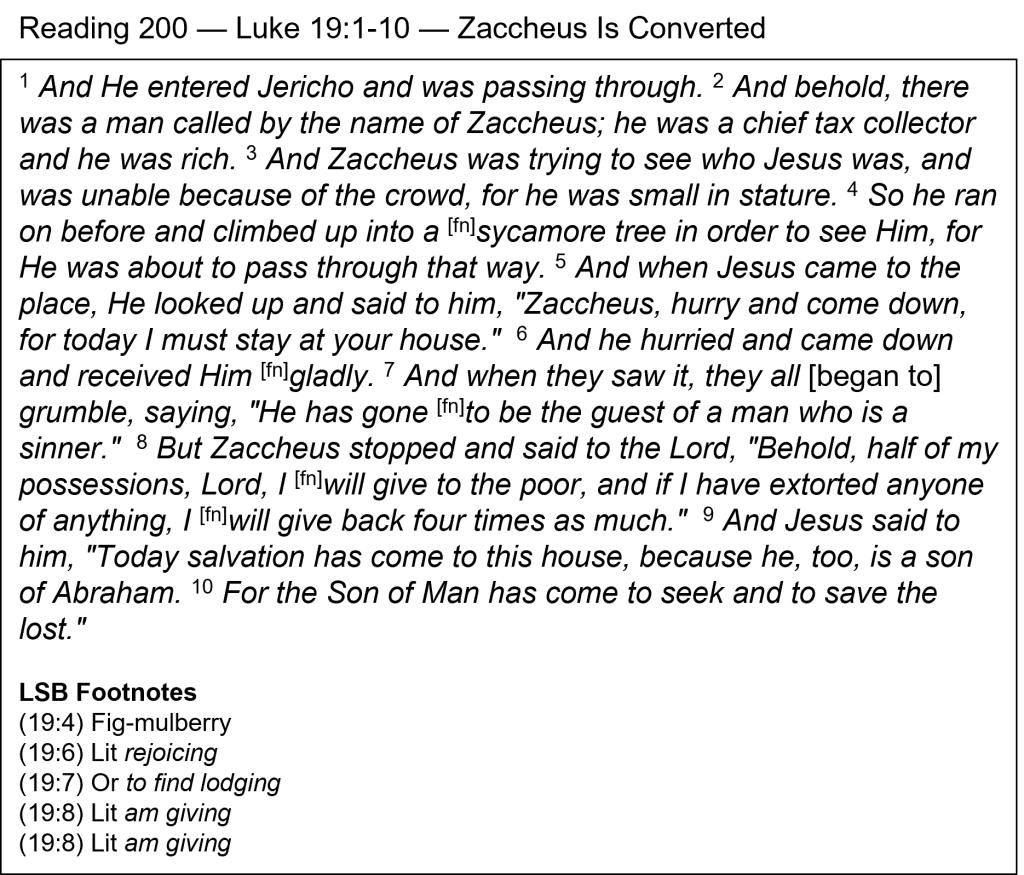 To Seek and Save — There were two Jericho cities in Jesus’ time. The OT Jericho was on the main road going to Jerusalem. Yesterday, we read that Jesus healed Bartimaeus as He was leaving that city. The Jericho He entered in today’s reading was a nearby modern city built by Herod the Great at the end of a different dead-end road that led from the main road. Jesus went out of His way to go there. Why? It was to meet and bring salvation to Zaccheus. He said, “I must stay at your house” (v. 5). That is a statement of necessity; He was being directed by the Father. He came to seek and save Zaccheus. A similar statement was made when Jesus was sent to the Samaritan woman at the well: “He had to pass through Samaria” (John 4:4). Zaccheus had obviously heard about Jesus but had never seen Him nor heard Him teach. On the other hand, Jesus knew Zaccheus’ name, calling him down from the tree (Luke 19:5). He showed that He was omniscient (all-knowing). Jesus then invited Himself to Zaccheus’ house, which upset the crowd following Him, because he was a known “sinner” (v. 7). Jesus knew that, too, but He was on a mission to save. Even before they got to his house, “Zaccheus stopped…” (v. 8). It was a point of decision. This sinful tax collector then told Jesus that he would give half of his possessions to the poor and pay back those he had defrauded. Between the tree and the house, he was converted. He was bearing “fruits in keeping with repentance,” as John the Baptist had challenged the Pharisees when he was baptizing (Luke 3:8). Jesus confirmed his conversion by saying, “Today salvation has come to this house” (19:9). Zaccheus had always been “a son of Abraham” physically, but now he had become “a son of Abraham” by faith, as Paul confirmed: “…those who are of faith … are sons of Abraham” (Gal. 3:6). Jesus is still going out of His way to seek and save the lost.
