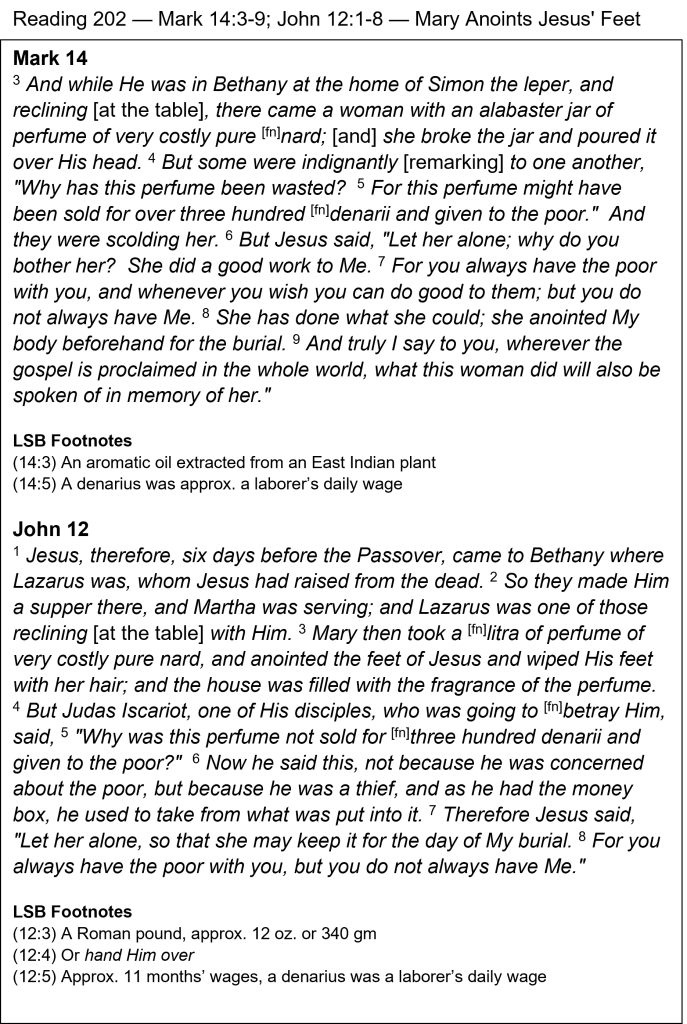 Let Her Alone! — We read earlier about a different woman, a “sinner,” who anointed Jesus’ feet with perfume, but today’s reading is a different person and event. Martha was serving at this dinner, but it was located at Simon’s house. Mark doesn’t mention that the woman anointing Jesus was Mary, and he recorded only that she poured the perfume over His head, while John’s account gives her name and that she also anointed His feet. I love Jesus’ response to the petty complaints of Judas and others: “Let her alone” (Mark 14:6 and John 12:7). They thought her actions were wasteful, but Jesus thought they were precious. Mary was making a huge financial sacrifice to demonstrate her love for Jesus. What kind of sacrifice are you giving to God because of your love and gratitude? Sacrifice is characteristic of deep love. Jesus also pointed to His coming death at this dinner: He said that Mary had “anointed My body beforehand for the burial” (Mark 14:8), and that some of it should be kept “for the day of My burial” (John 12:7).