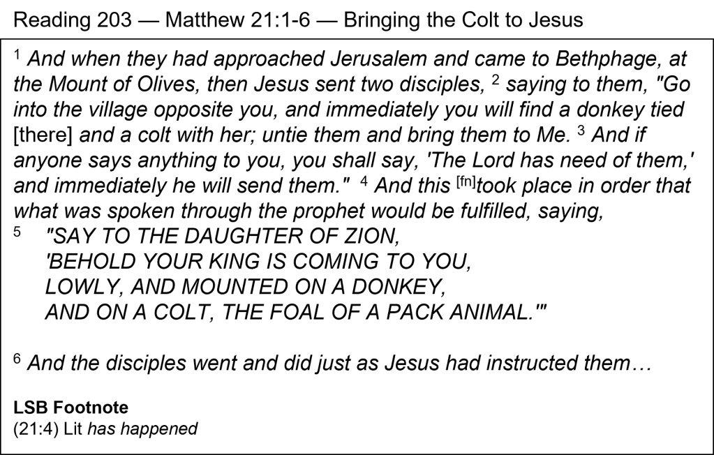 Your King is Coming — The Triumphal Entry is the official declaration of Jesus as the Messiah as He faced His sacrificial death. This occasion is of great importance, being only the second event recorded by all four Gospel writers (the first one being the feeding of the 5,000). Our reading for today shows, first, the omniscience (all-knowingness) of Jesus. He told the two sent disciples, “you will find a donkey tied there and a colt with her” (v. 2). He knew they were there in advance. If anyone questioned them, they were to say, “The Lord has need of them” (v. 3). That also shows Jesus’ authority. As “Lord,” He was steering the whole event. Finally, He was showing His obedience by fulfilling the prophecy of Zechariah 9:9. That “YOUR KING IS COMING TO YOU,” is an identification of Jesus as the Messiah, the final King of Israel. Jesus arranged His dramatic entry into Jerusalem on a donkey’s colt in order to fulfill a 500-year-old prophecy.