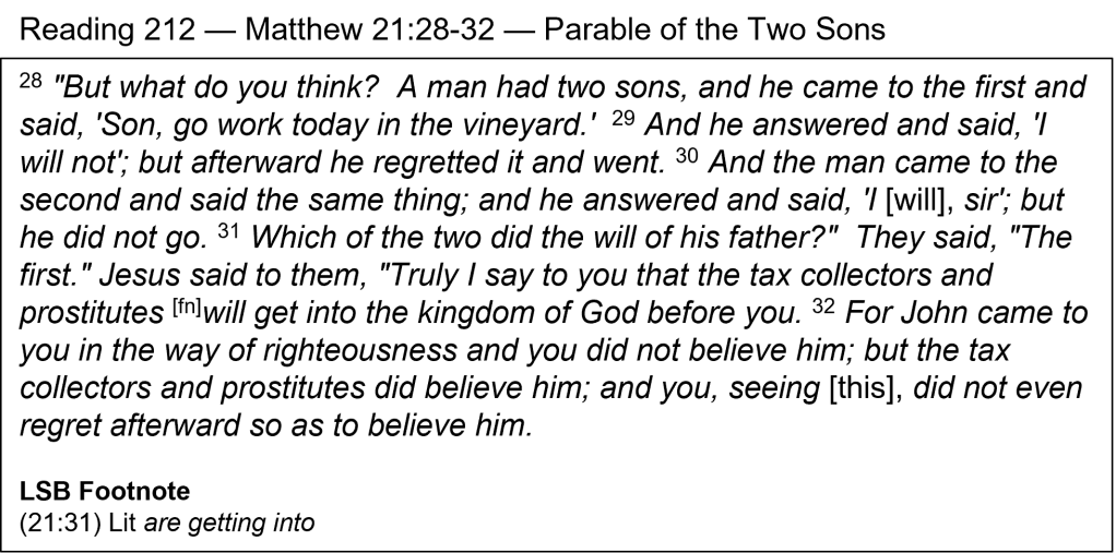 Exposing Hypocrisy — This parable immediately follows the question Jesus asked the Jewish leaders about John the Baptist. They had refused to admit that they believed John’s baptism was not from God. So, in today’s reading, we see Jesus exposing their hypocrisy. The son who first refused, but regretted it and went to work, was like the sinful tax collectors and prostitutes who believed John and repented. The second son had the talk but not the walk, like the Jewish leaders who claimed that they believed God, but their lives didn’t show it. They would not acknowledge their sin and turn to follow those whom God sent to them. Jesus was hard on hypocrites because He knew their hearts.
