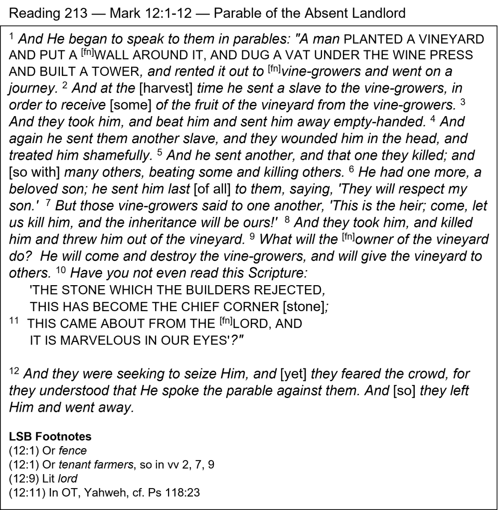 Blatant Rejection — The Jewish leaders who challenged Jesus were still present, so Jesus told another parable that was directed “to them” (v. 1). The vineyard often represented Israel in the OT, so the parable’s tenant vine growers were Israel’s religious leaders, the owner was God, the sent slaves were God’s mistreated prophets, and the “beloved son” (v. 6) was the Messiah, Jesus. The rejected “stone” (a quote from Ps. 118:22-23), would become the chief cornerstone of a new building, not primarily for Jews but for all peoples. In the parable, after killing his son, the owner would “give the vineyard to others” (v. 9), which would be mostly Gentiles. The Jewish leaders “understood that He spoke the parable against them,” but it didn’t change their evil intentions toward Jesus, and “they were seeking to seize Him’ (v. 12). Notice that they again showed cowardness toward the people: (“they feared the crowd”). Psalm 118 served as a warning, predicting their rejection, but instead of recognizing their wrong direction and turning from it, they plowed ahead to do what would ultimately fit perfectly into God’s plan of sacrificing Himself as the final Paschal Lamb.