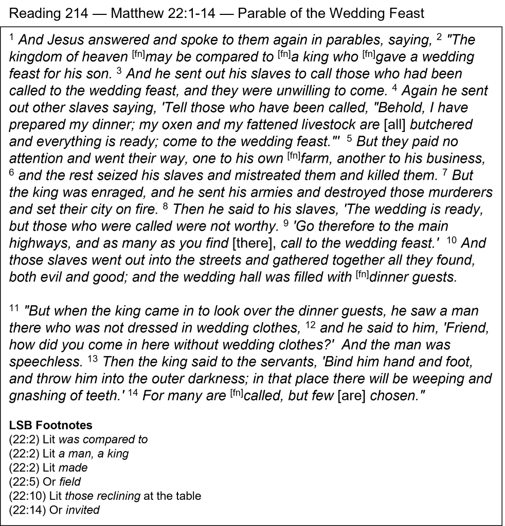 Called vs. Chosen — Even after the Jewish leaders left, Jesus continued to teach about God’s kingdom being expanded to the Gentiles following its general rejection by the Jews. In this parable, the king represents God, and the wedding feast is defined as the “kingdom of heaven” (v. 1). It is like the “marriage supper of the Lamb” described in Rev. 19:7-9, where the church, His bride, was given clothing of “fine linen, bright and clean … [which] is the righteous acts of the saints.” In Jesus’ parable, therefore, although both “evil and good” people were brought to the feast (Matt. 22:10), the improperly dressed man showed no repentance or evidence that he had been converted. He was called but not chosen; he was in the church building but not in the church family. The first call went out to Israel, but they were “unwilling” (v. 3) and “paid no attention” (v. 5). The second call was broader, going into “the main highways … streets … and [they] gathered together all they found” (v. 9-10), probably referring to Gentiles. At the time Jesus told the parable, His audience was composed of Jews. Would they continue to be unwilling and pay no attention to the call, or would they be changed by the Messiah?
