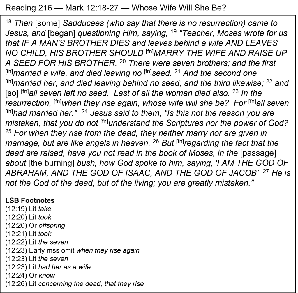 Better Than Marriage — The Sadducees were a smaller, but powerful, Jewish group; the chief priests came from that political unit, and they seemed to trust only the OT books of Moses. They didn’t believe in the resurrection or in angels. Like the Pharisees and Herodians in yesterday’s reading, the Sadducees also came to Jesus deceptively, trying to outsmart and trap Him. After presenting their exaggerated hypothetical case, they asked, as if they believed in the resurrection, “In the resurrection, when they rise again…” (v. 23). Jesus said they were mistaken for two reasons. The first, He said, was because “you do not understand the Scriptures” (v. 24). Although the five books of Moses don’t directly mention the resurrection, the prophet Daniel clearly said that “many of those who sleep in the dust of the ground will awake, these to everlasting life, but the others to reproach [and] everlasting contempt” (Dan. 12:2). The Sadducees were mistaken because they did not understand that “All Scripture is God-breathed and profitable for teaching …” (2 Tim. 3:16). The second reason Jesus said they were mistaken was because they did not understand “the power of God” (Mark 12:24). That was not only resurrection power, but it also included His ability to create relationships in heaven that will be far better than the best of those on earth, including marriage.
