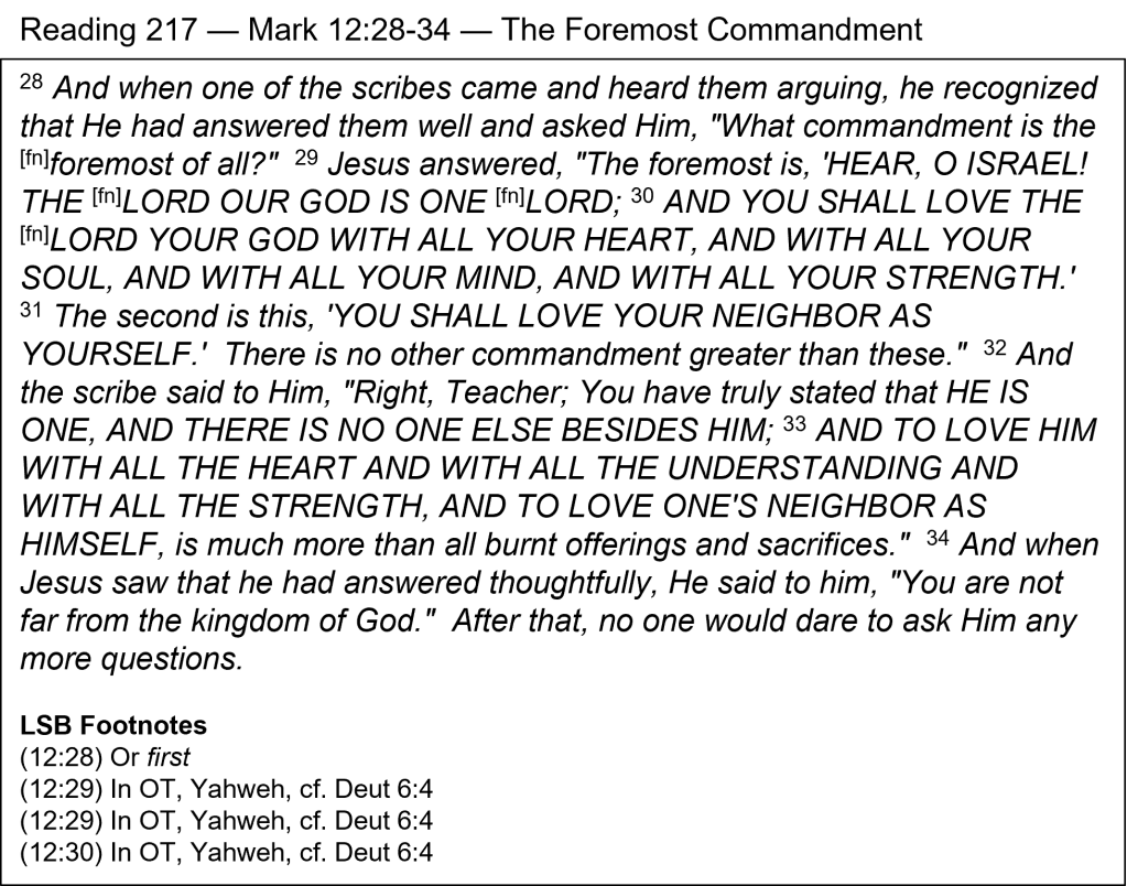 Not Far — Like the interview with Nicodemus, this is a rather rare, more positive encounter Jesus had with one of the religious leaders of the Jews. Jesus saw his honesty and openness, that “he recognized” that Jesus had answered the Sadducees well (v. 28a). His question was not a constructed trap, and it seriously sought a truthful answer: “What commandment is the foremost of all?” (v. 28b). Jesus was also straightforward in His answer, which was to wholeheartedly love God and one’s neighbor. The most important thing we can do to please God is to love—love Him and love others. The scribe affirmed Jesus’ answer, summarizing it in his own words, and adding that loving God was even more important than the worship activities of offering sacrifices (v. 33). John Piper has said, “Take more delight in the Savior than in His service.” Jesus saw that this scribe was close to the Kingdom because “he had answered thoughtfully” (v. 34). He was not quite there, however. What was he lacking? He had probably not yet recognized that Jesus was the Messiah, the Savior for the world. Close, but not quite. He had grasped it intellectually but needed to experience it relationally. My guess is that he, like Nicodemus and Joseph of Arimathea, came to faith in Jesus after His resurrection.