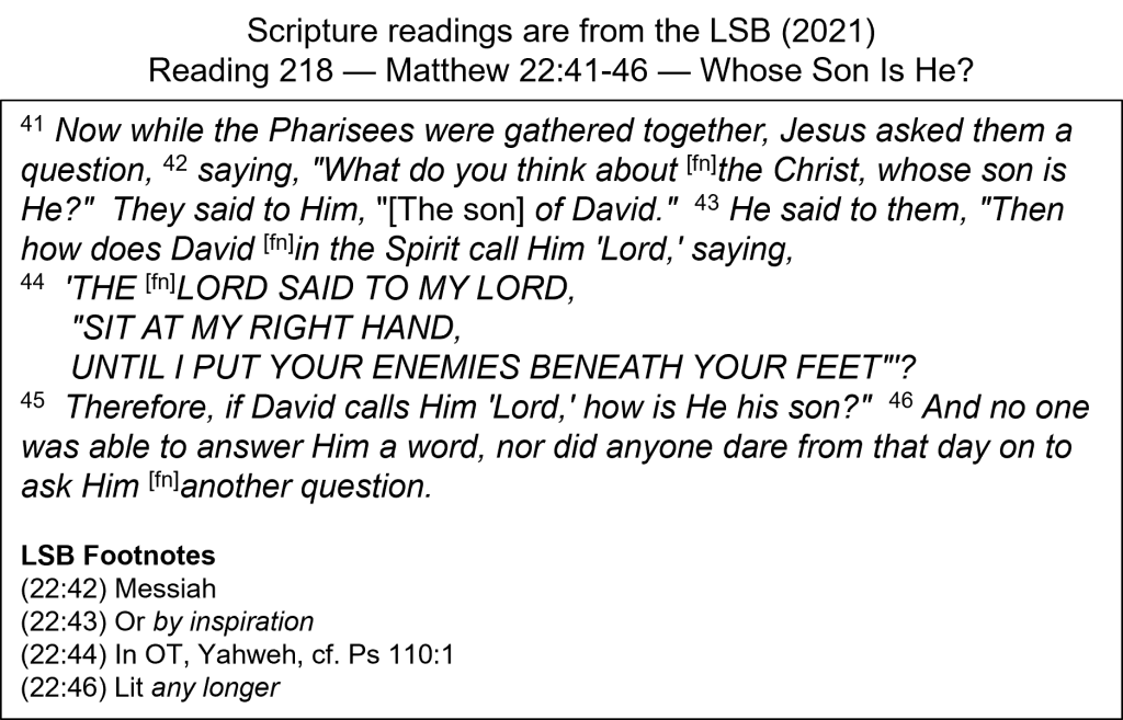 Not a Word — After the Jewish leaders asked Jesus difficult questions, He took the offensive and asked them this basic question: “How can David call his own son ‘Lord’?” Jesus reminded them that David spoke this “in the Spirit” (v. 43), so that statement (from Psa. 110:1) was inspired by God and could not be refused. They could not doubt the truth of what David wrote. David could call his son “Lord” only if his son were above him. The correct answer would have been that David’s predicted descendant would not only be the Messiah but would also have to be divine. He would be God in the flesh. The Pharisee group was stumped (“…no one was able to answer Him a word”—v. 46). They had been stopped, not simply by a very smart teacher but by the Son of God Himself. It is sometimes tempting for us to question some things we read in Scripture that are difficult to understand or difficult to do. We want to say, “Yes, but…,” and offer our excuses when we should remain silent. Our “Yes, but…” should become, “Yes, Lord.”