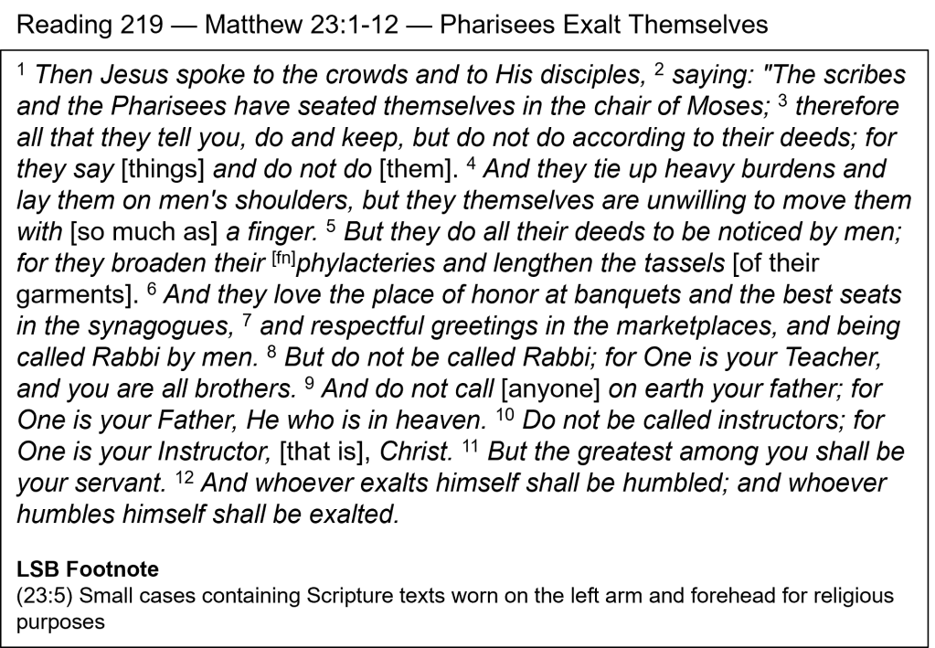 All About Pride — As we will read tomorrow, some of the scribes and Pharisees were apparently still present when Jesus told the “crowds and … disciples” (v. 1) about how they should relate to those leaders. Jesus had called them hypocrites to their faces, and now He shows His followers additional evidence. They should follow the leaders’ teaching regarding what Moses wrote, but not about what they had added in the form of tradition. They also should not follow their example because they were hypocrites, putting on a false show of superior righteousness and status. Motivated by pride, they scrambled for honor. That attitude is certainly prevalent in our modern culture, too. We sometimes even see it within our churches, which is directly disobedient to Christ’s command. When it happens, it is because we have allowed our sinful nature to rise above Jesus’ instruction, and it has negative consequences, i.e., “whoever exalts himself shall be humbled” (v. 12a). Do we really want to be publicly shamed? What Jesus wants us to do is to purposely and willingly humble ourselves, so He can exalt us (v. 12b). We must place Jesus as our perfect example. He said, “I am gentle and humble in heart” (Matt. 11:29).