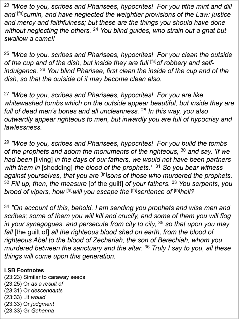 The Lion of Judah — We read yesterday that Jesus was gentle and humble at heart. With the lost and hurting, He was like a lamb. On the other hand, He was also aggressively bold and accusing at times. With the Jewish leaders, He was like a lion. Seven times in today’s passage, He declared, “Woe to you!” This expression contains sorrow as well as condemnation. He cared for these hardened opponents, but He had to use painful words of warning to try to wake them up to the truth. It was like crying out, “Please stop it!” He was speaking to the religious leaders of the people, and they were leading the people astray rather than toward God. They were burdening them with nonessential requirements and focusing on minute details, rather than much more important things that God commanded. Their hypocrisy was like dressing up pigs, futilely attempting to appear better than they were. In the end, they were murderous. Like their fathers, they were in the process of scheming to kill Jesus, the most righteous man who ever lived. They would do the same to Jesus’ followers later. I wonder if Saul was in the crowd that day. If so, he didn’t take the warning to heart until Jesus met him on the road to Damascus several months later. If you have time, read through this passage again and see to what degree you see yourself in some of those hypocritical attitudes the scribes and Pharisees had. Ask God to show you where you are lacking and to help you change.