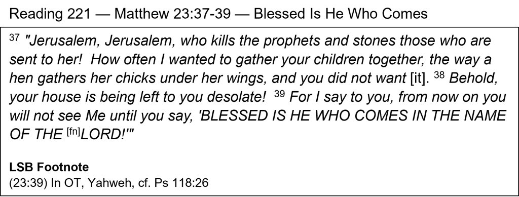 Left Desolate — This is the second time Jesus made this statement about wanting to gather the people of Jerusalem under His wings for comfort and protection (cf. Luke 13:31-35). He repeated it again as He approached His death. It shows the sad, but loving, heart of Jesus. He came to offer salvation to the Jewish people, but most of them refused the offer. The psalmist said, “The stone which the builders rejected has become the chief cornerstone” (Psa. 118:22). The stones of the beautiful temple Herod had built for the Jews would be destroyed in A.D. 70 by the Romans, and the spiritual “house” of Israel would be left desolate (Matt. 23:38). The final quote from Jesus in today’s paragraph comes a few verses later in the same psalm: “Blessed is the one who comes in the name of Yahweh” (Psa. 118:26). There will be a great turning of the Jews to Christ at the end, and when He returns, many of them will be exclaiming praise to the One whose fathers had rejected Him in Jerusalem.