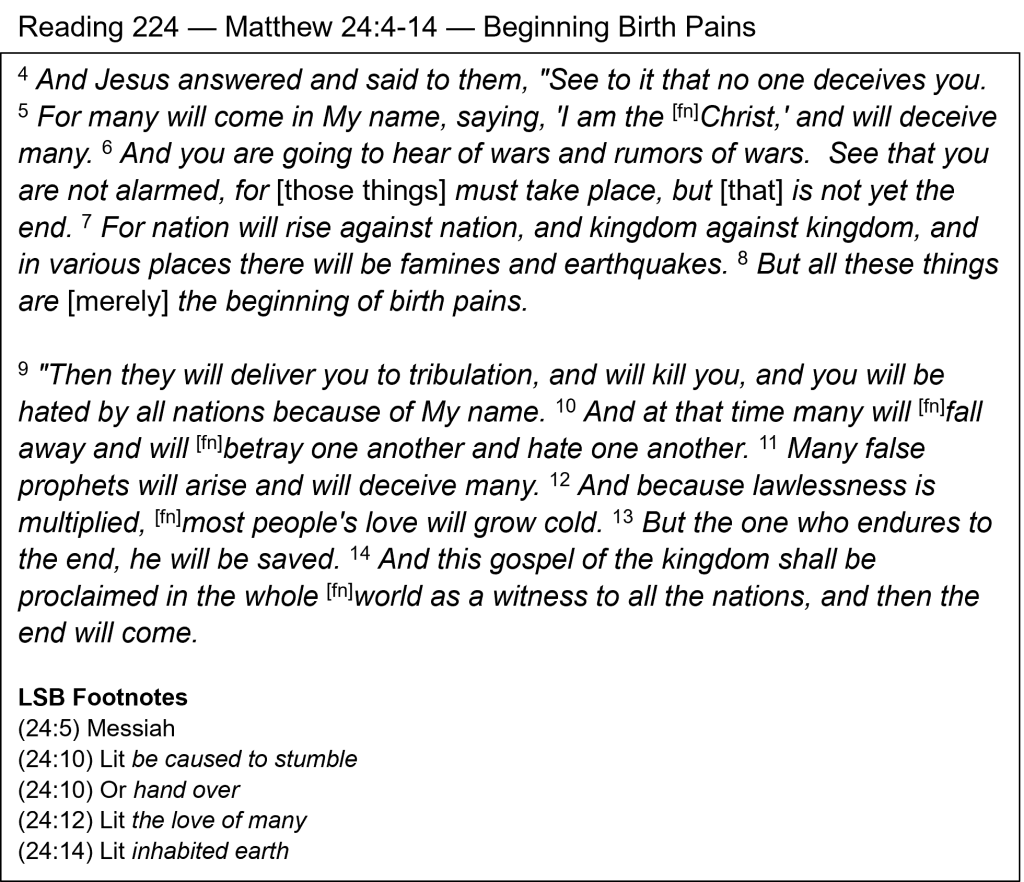 What and When — The first temple in Jerusalem was built by King Solomon, and it was beautiful. It was destroyed almost 400 years later by the Babylonians. After Israel’s captivity, Ezra organized the building of the second temple, which was much smaller than the first one. About 500 years later, King Herod rebuilt and greatly expanded that temple area. This magnificent structure was essentially complete by the time of Jesus’ death. No wonder one of the disciples declared, “what wonderful buildings!” Then Jesus burst his bubble by predicting its complete destruction, so that “Not one stone will be left upon another” (v. 2). He must have been referring to the temple building itself, because there remains even today the Wailing Wall, part of the western wall that surrounded the Temple Mount. Jesus could see that event in the future. That prophecy’s fulfillment of destruction would come about 40 years later when Titus led the Roman army to tear down the temple as a part of squashing a rebellion of the Jews. The other disciples heard His reply, as shown by their follow-up question about when it would happen. What follows, in our next several readings, is a lengthy message regarding not only the near-future destruction of the temple in judgment, but also the still-future judgment that will accompany the return of Christ. Jesus could see the end, so He began to tell His disciples much about what will happen and when. We are still waiting for much of that, and it seems to be getting very close.