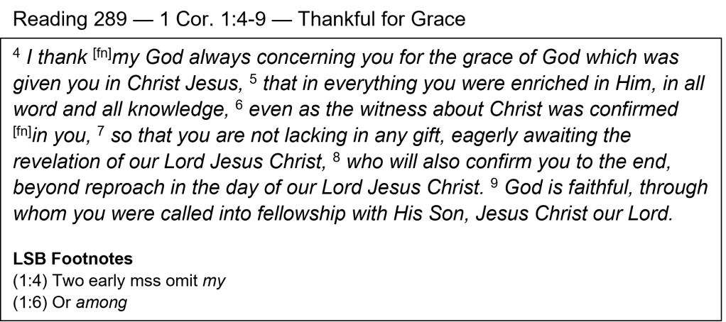 Enriched and Confirmed — The Corinthian Christians were given spiritual gifts just as we have, but they often misused them in selfish and prideful ways that created conflicts within the church. They “were enriched” by these gifts (v. 5). The Greek word for “enriched” is used only two other times in the New Testament, both in 2 Corinthians. One shows contrasts going on in a Christian’s life: “… sorrowful but always rejoicing, as poor but making many rich, as having nothing and yet possessing all things” (2 Cor. 6:10, emphasis added). Although we may be poor materially, we can enrich others by giving to them spiritually. We can also give to others materially, as Paul mentions in the context of the Corinthians’ responsibility to support those who minister to them professionally: “you will be enriched in everything for all generosity” (2 Cor. 9:11). Jesus enriches us so that we can enrich others. In this passage, Jesus not only enriches us, but He also confirms us, mentioned twice here. It is sometimes translated, “establish,” “make firm,” or “make sure.” The first confirmation mentioned here is that “the witness about Christ was confirmed in you” (v. 6). The message took root and produced fruit, proving that Jesus was dwelling within them. We also receive that confirmation when we are born again by the Spirit. Paul said that “our Lord Jesus Christ … will also confirm you to the end” (v. 8). That indwelling confirmation of our salvation will stay with us forever because we are secure in Christ’s righteousness. We are established, made firm, and made sure in Him.