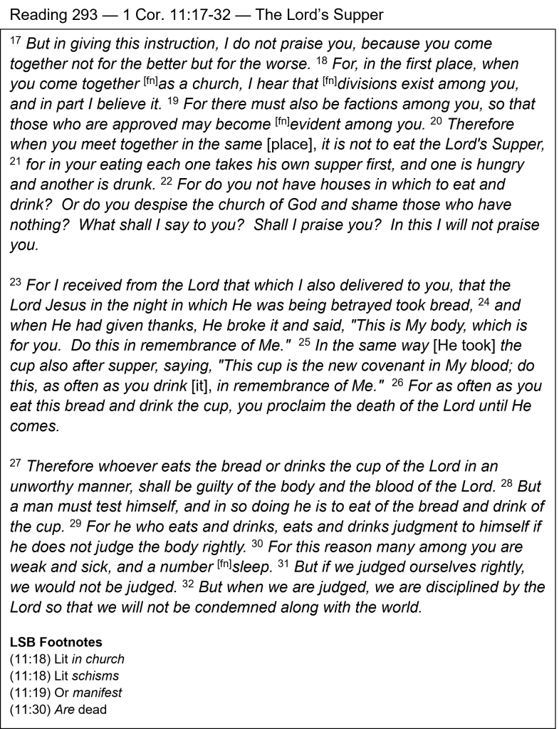 Sacred Table — Paul’s review of Jesus’ institution of the Lord’s Supper emphasized the sacredness of the event. First, he said that it should reflect unselfishness. The Corinthians had let it develop into a party time, focusing on themselves to the neglect of poorer people who came with little or no food. It was a non-sharing potluck meal. Everything about Christ’s death on the cross displayed sacrifice, unselfishly doing something good for others. It was shameful to celebrate Christ’s sacrifice with a selfish meal. The Lord’s Supper was meant to be a sacred ceremony. Second, Paul said it should reflect thanksgiving. It should be done “in remembrance of Me” (vv. 24-25). Jesus died for me! His love, willingness to suffer, and forgiveness were all involved in His death. He paid my penalty! Our participation in this regular ceremony should be done with deep gratitude for what He did for us. Third, Paul said that it should reflect the message because through it we “proclaim the death of the Lord” (v. 26). It is evangelistic, demonstrating to those uncommitted people in attendance that Jesus died for sinners, and forgiveness is offered through His sacrifice. Fourth, Paul said that it should reflect sincerity. We are not to partake of it “in an unworthy manner” (v. 27), but each one “must test himself” (v. 28) and “judge … rightly” (v. 29). It should be a time of confession and repentance. It is more than a religious ceremony; it is a sacred time for sincere turning, for appreciating His loving, unselfish sacrifice for us. It is a sacred event.