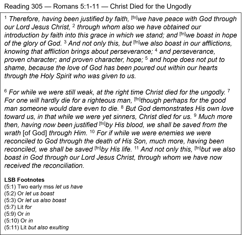 Loving the Needy — Christ’s death was motivated by God’s love (v. 8) and a desire to save us from His wrath (v. 9). He reached out to us, who were desperately in need and could not help ourselves. Our need was described in these four ways: We were “weak” and “ungodly” (v. 6), “sinners” (v. 8), and “enemies” (v. 10). While we were helpless, God reached out to us in love and sacrifice. A newborn baby is totally helpless physically and desperately needs a caring mother. As sinful adults, we are just as needy spiritually, although most people don’t recognize or accept it. On the positive side, six benefits are listed here that we receive by coming to Christ by faith. We are justified (being declared righteous by God—vv. 1, 9); we have peace with God (v. 1), grace and hope (v. 2), salvation (vv. 9, 10), and we are reconciled to God (v.10). God gives wonderful gifts to unworthy sinners. All this was accomplished through the loving, sacrificial death of Jesus. What a wonderful Savior!