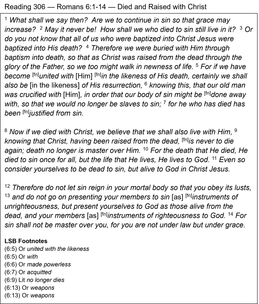 Modeling Change — Jesus is presented as our model in this passage. As He died, carrying the sins of the world, so we should consider sin as no longer having a part in us. Jesus died “once for all” (v. 10), as opposed to the regular animal sacrifices the OT law required. It was finished; it has ended. The once-for-all event for us was when we surrendered our lives to Christ for salvation. Because sinful nature stays with us, however, we are tempted to dip back into our old ways of slavery. We should have posted a tombstone at the foot of the cross, marked, “SIN DIED HERE.” Jesus paid for our sin, and we were freed from its bondage. We shouldn’t be like a diabetic who decides to eat a little ice cream for dessert! Jesus is our model: “He died to sin once for all” (v. 10a). He is also our model for living righteously: “the life that He lives, He lives to God” (v. 10b). Our correct response obeys this command: “present yourselves to God as those alive” (v. 13). Live for God, not for sin! We are to be obedient to God instead of to sin. Jesus’ death has paid the penalty, and His grace continues to give us freedom so we can live outside the walls of that prison of sin.