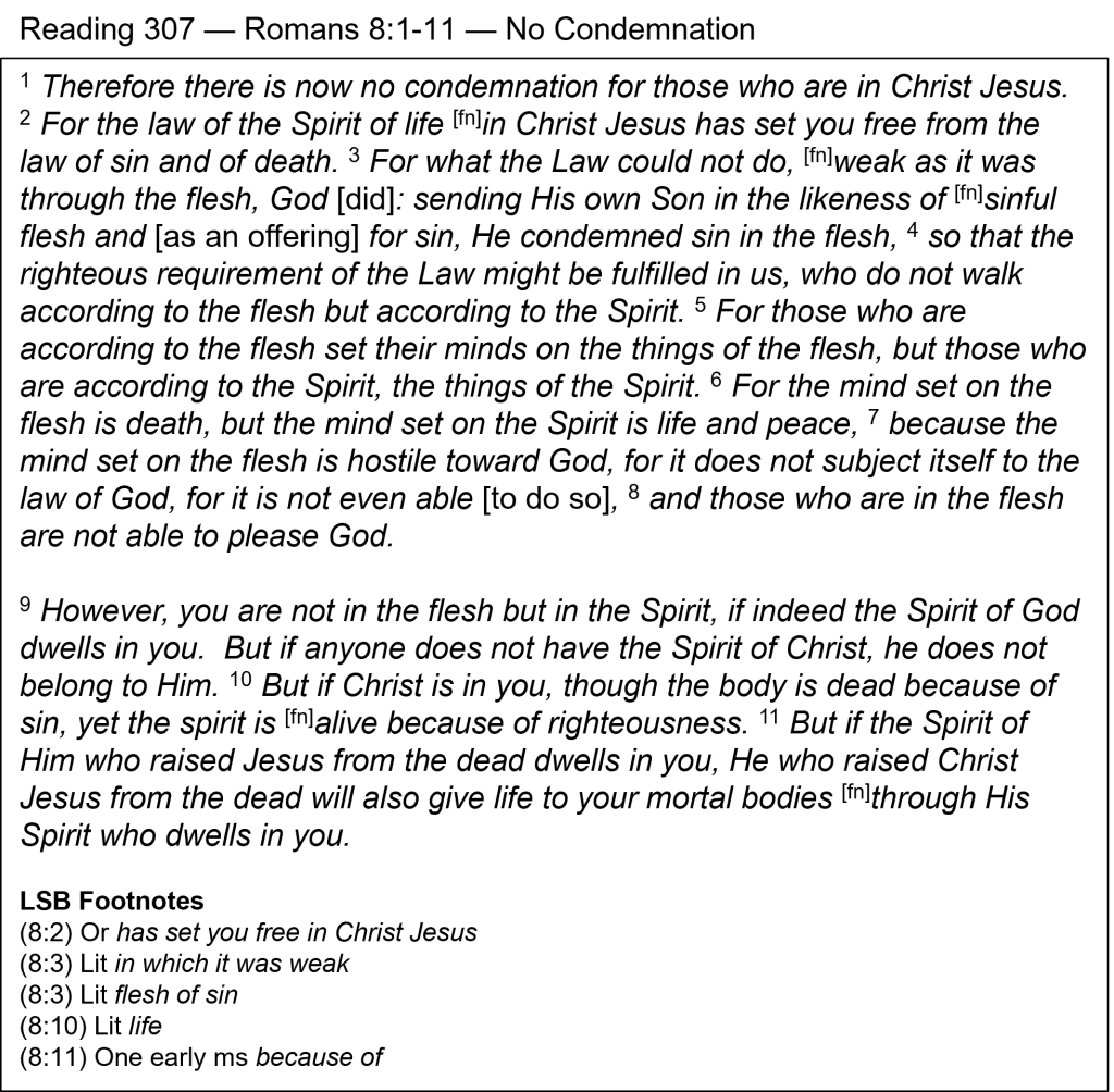 New Life — We encounter another passage today that speaks of the Father, Son, and Holy Spirit—the complex Godhead, Yahweh. The Father sent the Son (v. 3) to accomplish His plan for the salvation of mankind. That plan was for the sinless Son to become a man, take upon Himself the sins of mankind, and pay the penalty of death on a cross as a punishment to satisfy the perfect justice of the Father. By that act, “He condemned sin in the flesh” (v. 3). Sin was condemned so there would be “no condemnation for those who are in Christ Jesus” (v. 1). Jesus paid our penalty. We are offered and given salvation’s gracious gift through placing our faith in Christ. When that happens at our conversion, not only does Jesus come to dwell within us (“if Christ is in you”—v. 10), but the Holy Spirit does as well (“if the Spirit … dwells in you”—v. 11). Something divine happens to us and we become alive spiritually. Our subsequent responsibility, then, is that we should “not walk according to the flesh but according to the Spirit” (v. 4). We now have a new master, a new life, and a new purpose. Believers are to “set their minds on … the things of the Spirit” (v. 5), which will result in “life and peace” (v. 6).