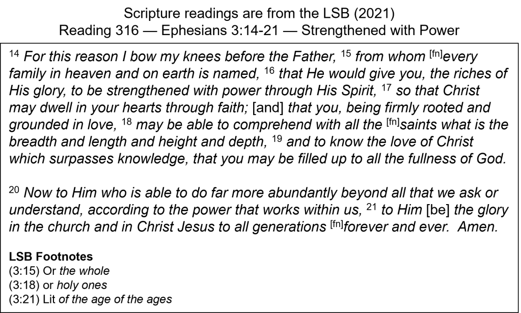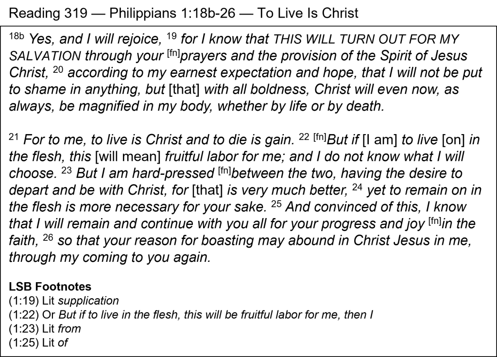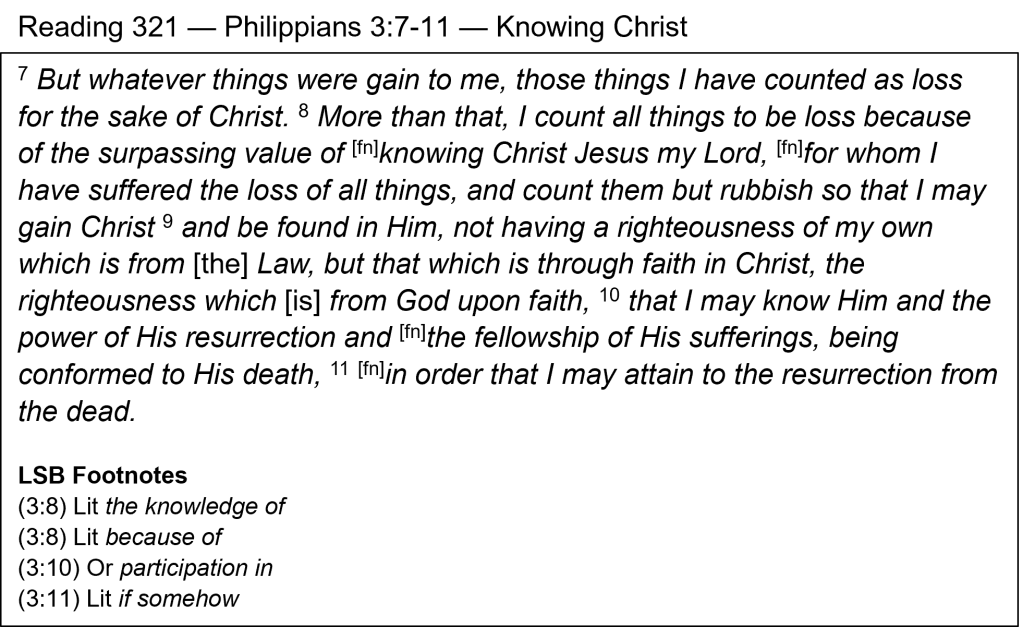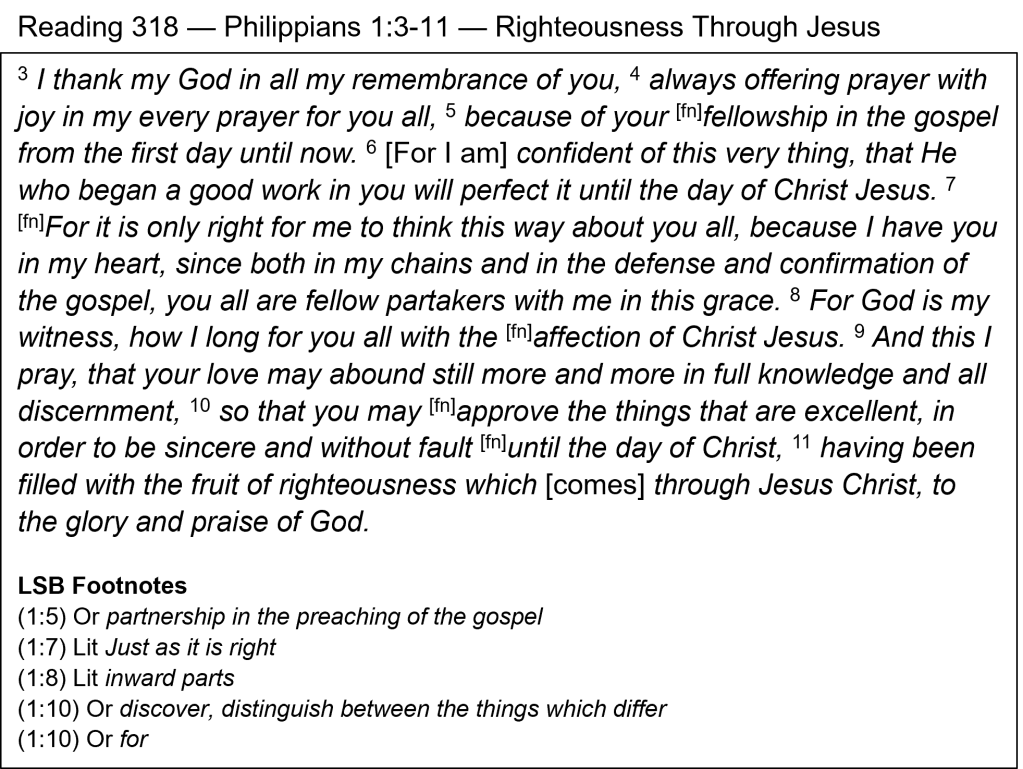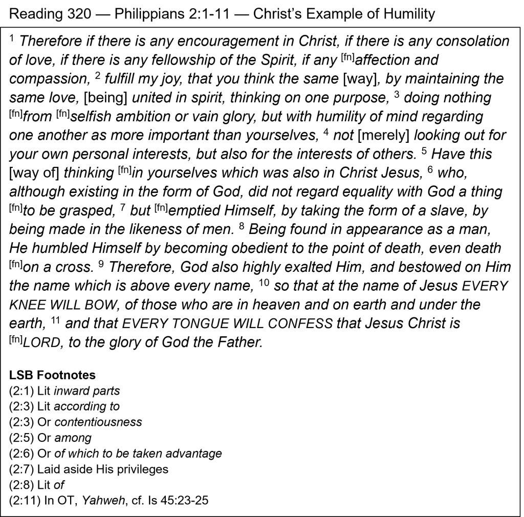 Meditation: The OT quote in vv. 10-11 is from Isaiah 45:23. Commenting on the expression, “that Jesus Christ is LORD,” the ESV Study Bible says: “In Isaiah these words apply to Yahweh, the personal name for God. Thus, when Paul claims Jesus Christ is Lord, he is saying that Jesus is God.” The Legacy Standard Bible capitalized “LORD” here to indicate that, in Isaiah, it refers to the name Yahweh. The LSB is the only major English translation to translate the OT Hebrew word as “Yahweh” instead of the substitute expression, “the LORD.