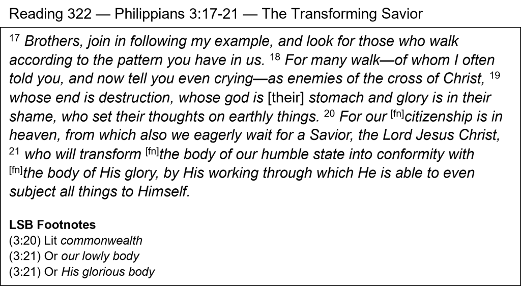 Changed and Changing — In this passage, Paul contrasts unbelievers, whose minds are “on earthly things” (v. 19), to believers, whose “citizenship is in heaven” (v. 20a). Although we are not in heaven yet, we belong there and we should act like it, not like those whose selfish focus is on things of this earth. We are not in heaven yet, but “we eagerly wait for a Savior, the Lord Jesus Christ” (v. 20b). We who have been changed through conversion are going there, and Jesus has promised to come to get us. Those believers who have died and gone to Paradise before us are there in some spiritual form, but when Jesus returns, He “will transform” all our bodies to be like His glorious body (v. 21). That will be our resurrection into a new kind of existence. While we wait, we are to follow the example of Paul and other godly Christians who are obedient and faithful, living like changed people.
