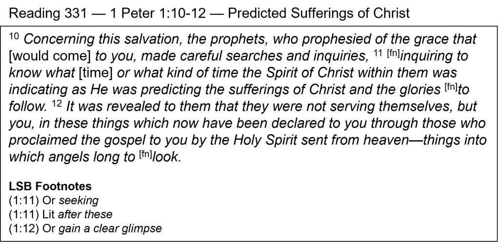 Suffering and Glory — What a privilege it is for us to have the Old and New Testaments! In their writings, the OT prophets pointed forward to the coming Messiah, but they didn’t understand it all. Some truth was revealed to them but not all of it. Now that we have the NT, much of what those OT prophets wrote is now clear because it has been fulfilled. The Holy Spirit revealed that the Messiah would have to experience suffering, and that it would be followed by glory (v. 11b), which referred to Jesus’ death, resurrection, and ascension. The prophets didn’t understand all of this; they were only told that it was intended for our later understanding (v. 12). The gospel message was later proclaimed, but even the angels don’t completely understand it, being information “into which angels long to look” (v. 12). The footnote for this word “look” suggests it can mean to “gain a clear glimpse.” It is used only five times in the NT, and in three of those places, it describes Peter, John, and Mary Magdalene stooping to see what was inside Jesus’ tomb, which took time for their eyes to adjust to the darkness. It was more than a glimpse; it was the kind of look that develops. That is the way we ought to read the Bible, carefully reading, rereading, thinking about it, and asking questions about what we are reading. It is a great privilege to peer into God’s Word.