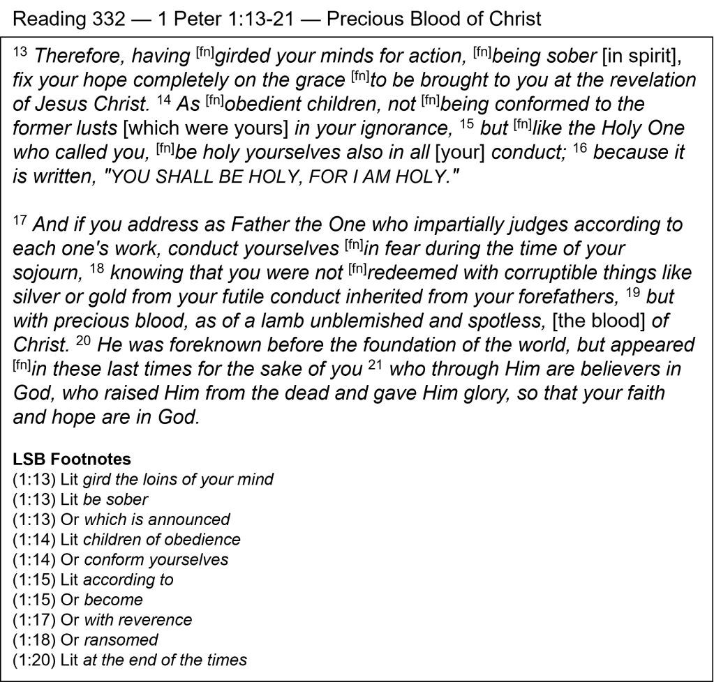 Redeemed or Judged — The main emphasis of this passage is holiness: “…like the Holy One … be holy yourselves” (v. 15). That is a very high standard and would be impossible, except that God gives us all we need to live holy lives. We are told here to “fear” God in two ways and for two reasons. We are to “fear” Him first as “the One who impartially judges according to each one’s work” (v. 17), and that is because Paul wrote that “we must all appear before the judgment seat of Christ” (2 Cor. 5:10). That is a being-afraid kind of fear—fear of being judged—and it provides an incentive for us to live holy lives. That reason of potential judgment precedes the word “fear” in verse 17 of today’s reading. What follows, in verses 18-19, shows the second kind of “fear,” that of reverence, which means having a great respect and admiration for who Christ is and for what He has done. Through His death on the cross, He “redeemed” us, paying the most valuable ransom price, His “precious blood.” Blood is precious because it keeps us alive, but Jesus’ blood was also precious because of who He was; He was the “unblemished and spotless” Lamb of God, the final Pascal Lamb. He was the Perfect Sacrifice.