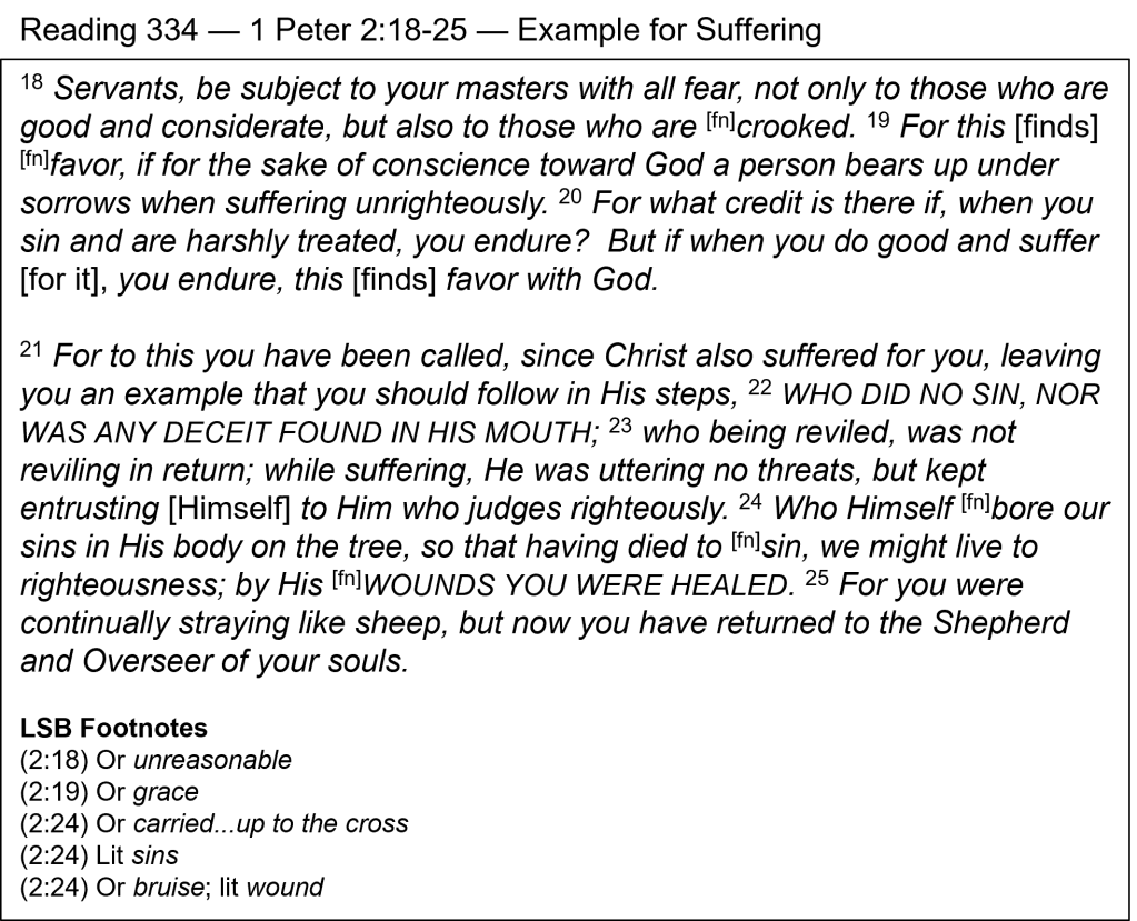 Suffering Unjustly — Occasionally, we find ourselves being accused of something we did not do, but more often, we suffer the consequences of our own wrongdoing. When we are wronged unjustly, however, we have Jesus as our example to follow (v. 21). First, He is our example for not retaliating, which goes against our natural tendency. If someone says something nasty to us, we want to respond to them with a nasty comment. When Jesus was “being reviled, [He] was not reviling in return” (v. 23). If our attacker sees that we do not retaliate, it provides a witness of God’s work in our lives. Jesus is also our example of not being judgmental. If we try to get even for a wrong done to us, we are acting as our own judge. Instead, we should do what Jesus did — He “kept entrusting Himself to Him who judges righteously” (v. 23). We are to turn over to the Divine Judge to decide and to apply the penalty where it is due. It is difficult to admit, but sometimes when we feel wronged, we share part of the blame. Let God decide and punish! Jesus is also our example of sacrifice. Rather than wanting to punish, Jesus willingly paid the penalty for those who had wronged Him. Rather than retaliating, He sacrificed for others, being the one “Who Himself bore our sins in His body on the tree” (v. 24).
