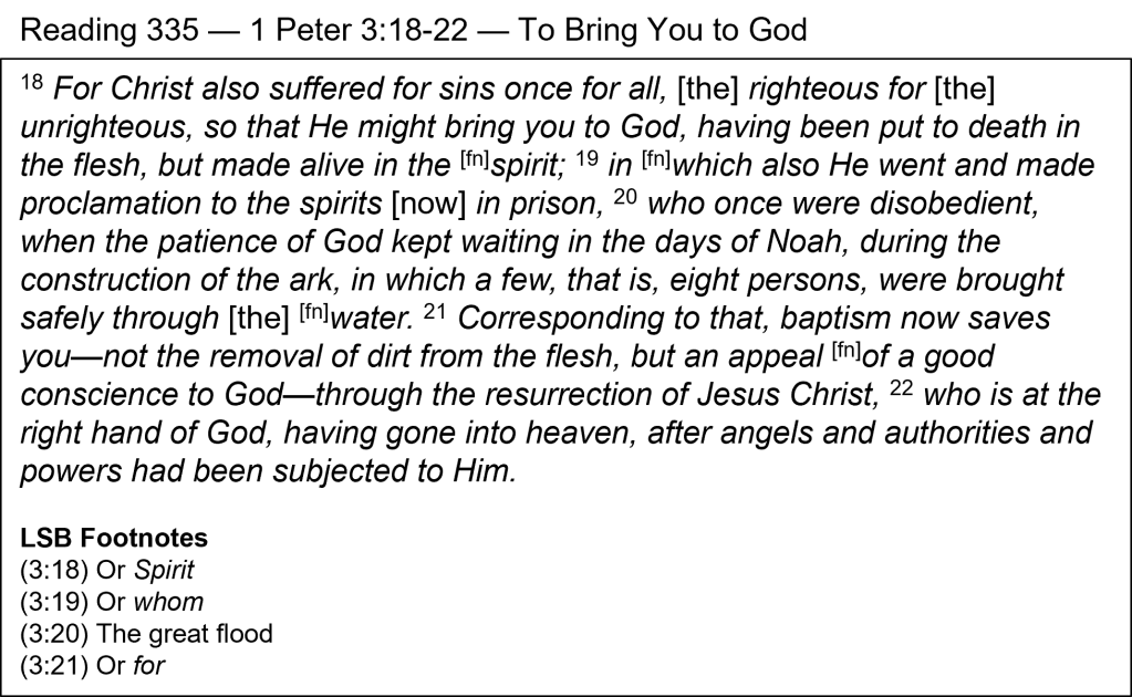 What Saves You? — There is some controversial content in this passage, but it starts out very clearly to state the doctrine of Christ’s substitutionary atonement, that the righteous Jesus suffered death for unrighteous people (v. 18). That concept is so opposite to our natural human understanding of fairness; we think that unrighteousness should be punished. So does God, but He satisfied His perfect justice with perfect love in offering to take our penalty upon Himself. That sacrificial act makes it possible for Him to “bring you to God” for salvation (v. 18). Sacrifice saves you. Now for the difficult part: Peter also writes that “baptism now saves you” (v. 21), using Noah’s ark as a comparison, both involving water. Roman Catholics take that statement literally, that the act of being baptized is what saves one. Evangelical Christians, however, focus on the “appeal of [or for] a good conscience to God” (v. 21), which represents faith as the saving means supported throughout the NT. We are saved through faith in Christ, and we are saved because of His substitutionary sacrifice for us on the cross. What a Savior!
