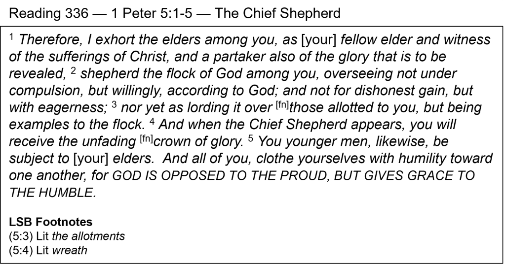 Levels of Leadership — There are three levels within the Church mentioned here. At the top is the Chief Shepherd, Jesus (v. 4). In the middle are the elders, the leaders of the churches (v. 1), Peter including himself in this category, although he was also an apostle. Most of us are on the bottom level, the sheep, who are to “be subject to your elders” (v. 5). The elders are to be “examples to the flock” (v. 3) as Christ is their ultimate example. That means that a higher standard is placed on the elders; if they are not example-worthy, they shouldn’t be shepherds. Jesus, as the highest example, was willing to suffer for the benefit of His sheep. Sacrificial shepherding is the standard placed before the elders. Since God opposes the proud, but gives grace to the humble, all of us are to “clothe yourselves with humility” (v. 5). That is an intentional act that is within our ability and responsibility. Then, there is reward for all of this: “…when the Chief Shepherd appears, you will receive the unfading crown of glory” (v. 4). Jesus is not only our sacrificing example, He is also our generous rewarder.