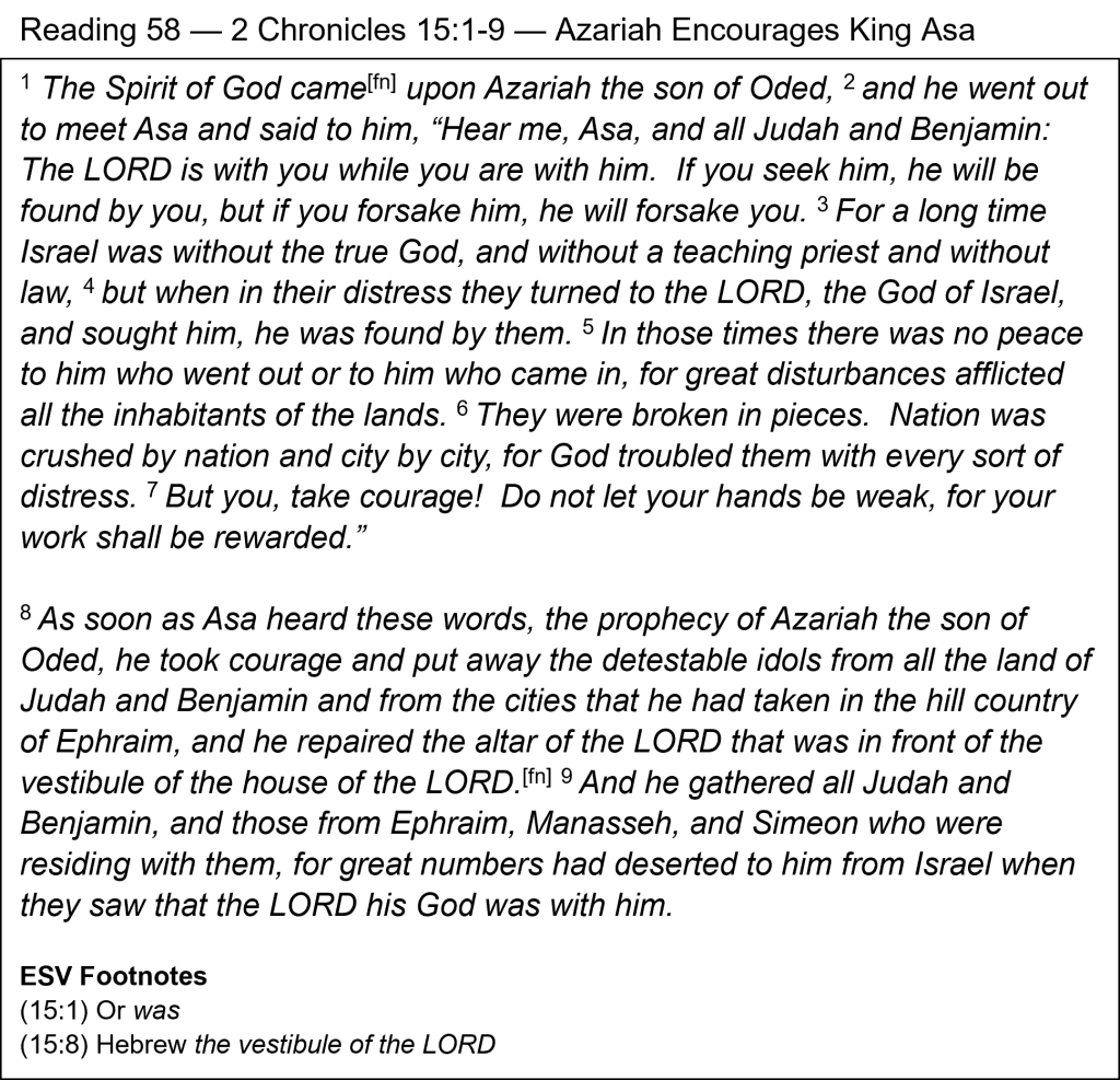 Prophesied Reward — Today we see another OT example of the Holy Spirit “coming upon” someone (v. 1). This otherwise unknown man named Azariah was used by God to be a prophet (verse 8 calls his message “the prophecy of Azariah”). We saw earlier that one of the names of the Holy Spirit is “the Spirit of prophecy” (Rev. 19:10). Azariah first proclaimed the principle that God is with those who seek Him (2 Chron. 15:2). He looked back in time and repeated the statement David made to his son, Solomon, “If you seek him, he will be found by you” (1 Chron. 28:9). He looked back even further to the vacillating time of the judges when worship of Yahweh was periodically abandoned, and they were “without a teaching priest and without law” (2 Chron. 15:3). It was only when they were in distress that “they turned to the LORD” (v. 4). We need to remember when we are distressed that trouble is sometimes brought on by God in order to turn hearts toward Him (v. 6). The core of Azariah’s prophecy from the Holy Spirit was this promise of victory: “…your work shall be rewarded” (v. 7). That “work” was the cleansing of Judah and Benjamin from the worship of false gods, and King Asa was therefore challenged to “take courage.” Because of that prophecy from the Holy Spirit, Asa continued his reforms and “great numbers … deserted to him from Israel” (v. 9). He reigned for an amazing 41 years. God rewards obedience.