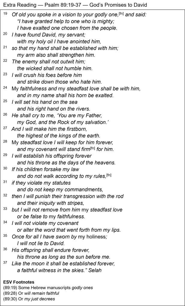 My Holiness — In this passage, focusing on David’s kingdom and his successors, God refers to “my steadfast love” (vv. 24, 28, 33) and “my faithfulness” (vv. 24, 33). Then, in verse 35, He speaks of holiness in the context of truth: “I have sworn by my holiness; I will not lie to David.” One must be truthful to be holy, and God is our example. He said, “Once for all I have sworn by my holiness.” It was a truth that would last (“Once for all…”), and it was an absolute truth that could be relied on (“…I have sworn”). Can your words be counted on? If they can, you stand out as being different in the culture around you, which often laughs at the idea of always being truthful. Even some Christians cave into the idea that there is such a thing as a “little white lie.” Not if you are holy! As Paul instructed us, “Therefore, having put away falsehood, let each one of you speak the truth…” (Eph. 4:25). Let’s build a reputation for being truthful because of our desire to be holy.