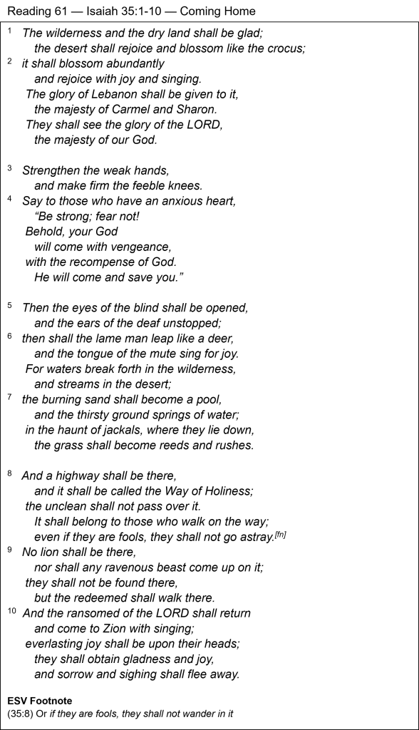 Highway of Holiness — When the people of Israel were slaves in Egypt, God promised them, “I will redeem you … I will bring you into the land that I swore to give to Abraham … I will give it to you” (Ex. 6:6, 8). He led them through the Red Sea and eventually into the land of Canaan. Almost 700 years later, Judah was facing a 70-year exile in Babylon, and Isaiah was giving them hope that “God … will come and save you” (Isa. 35:4) and lead them back to Zion. Isaiah then prophesied about another rescue by God, when the Messiah would come, healing the blind, deaf, lame, and mute (vv. 5-6), and open “a highway … called the Way of Holiness” (v. 8). That is the spiritual Highway to Heaven, the ultimate Promised Land. It is called “the Way of Holiness” because only “the redeemed shall walk there” (v. 9), those cleansed by the blood of Christ and separated by God as being holy. Along that Way and in that Land, “the ransomed of the LORD shall return … with singing … [with] everlasting joy … [and] gladness” (v. 10).