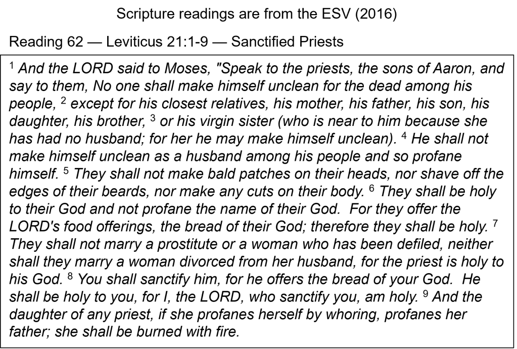 The Sanctifying One — Three times in this chapter, God declares that He is the one who sanctifies (vv. 8, 15, 23). There are two kinds of holiness spoken of in our passage for today. Most of it is about external or outward holiness. A higher standard was required of priests because they were involved with the holy objects in the temple and the holy offerings they prepared and burned on the altar (v. 6). How did they keep themselves holy? It was by outwardly abstaining from certain things, like not touching a dead body (except for a close blood relative—v. 2), not cutting their beards or bodies (v. 5), and not marrying a non-virgin (v. 7). They kept themselves holy by abstaining from things that defile, which is also what we ought to do. Paul instructed us, “…let us cleanse ourselves from every defilement of body and spirit, bringing holiness to completion in the fear of God” (2 Cor. 7:1). We are told to “Abstain from every form of evil” (1 Thess. 5:22) and to “abstain from the passions of the flesh” (1 Pet. 2:11). We keep ourselves holy by abstaining from what God considers to be unclean. That is how we keep ourselves holy, but we don’t make ourselves holy—God does that (“I, the LORD, who sanctify you, am holy”—Lev. 21:8). He does that by His holy presence in our hearts. His holiness makes us holy. That is inward holiness. He is the Sanctifying One who makes us holy.