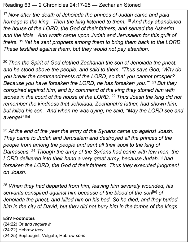 Spirit of Warning — When wicked Athaliah was about to slaughter all the king’s sons so she could be the ruling queen, the infant Joash was rescued by the wife of the priest, Jehoiada, and raised by them for six years (2 Chron. 22:11-12). Jehoiada had great influence on Joash after he became king at the age of seven, and he reigned righteously for 40 years (24:1-2). As we read in our passage for today, however, after the godly Jehoiada died, King Joash was influenced by other leaders and turned away from God. The Lord then sent prophets “to bring them back to the LORD … but they would not pay attention” (v. 19). Then God turned a priest into a prophet, as “the Spirit of God clothed Zechariah” (v. 20), to challenge and warn Joash and his rebellious influencers, but Joash agreed to have him stoned in the court of the temple. Why would the Holy Spirit empower Zechariah to speak this warning, only to be killed as a result? It didn’t bring King Joash back to God because he would be killed by his own servants that same year as God’s punishment for his rebellion (vv. 23, 25). The Holy Spirit’s desire was to turn people back to God, and likely some of those people did repent. Innocent Jesus also died as He reached out to offer forgiveness to rebellious people. We Christians, as God’s people and witnesses, may not be spared from suffering because we challenge and warn others to repent and turn to Him, but we are to continue to do it as the Holy Spirit empowers us.