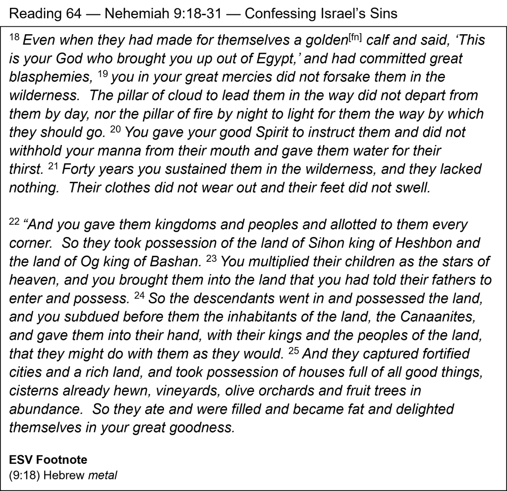 The Spirit Guides and Cautions — After many of the exiled Israelites returned from Babylon, under the leadership of Ezra (rebuilding the temple) and Nehemiah (rebuilding Jerusalem’s wall), they had a huge dedication ceremony to confess their sins and seek God’s blessing. Part of the Levites’ summary of Israel’s rebellious history was confessed in our reading for today, twice mentioning the Holy Spirit. The first time recalled how God “gave your good Spirit to instruct them” (v. 20) as they were led in the wilderness by the pillars of cloud and fire and provided with miraculously supplied manna, water, and clothes that didn’t wear out for 40 years (v. 21). How did the Spirit instruct them? Probably through the teaching of the priests and Levites, leading them in the way they should go. We are also instructed today by the Holy Spirit as we read His Inspired Word and sit under the teaching of His messengers. Through His guidance, we are told and encouraged to walk in God’s way for our own benefit. The Holy Spirit instructs us. After summarizing their many times of victory, rebellion, and defeat in the Promised Land, God’s patience was emphasized, and the second action of the Holy Spirit was mentioned: “…you bore with them and warned them by your Spirit through your prophets” (v. 30). This is more than instructing them in the way they should go, it was warning them of the consequences of disobedience. Many of the OT prophets were not well received by the people because their message was often one of warning. We don’t like to be told that we are wrong. It strikes against our pride. When we read the Scripture, however, we should pay just as much attention to the warnings as to the instructions. The Holy Spirit guides and cautions us.