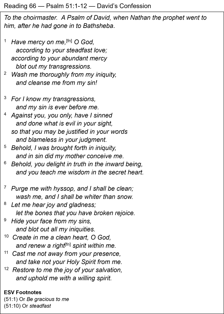 The Spirit-changing Spirit — David’s sin with Bathsheba and his arranging for her husband’s death was horrible, something that one would want to remain hidden, yet David not only confessed it to God, but wrote a psalm about it to be sung by congregations of people for their instruction and warning. He was thoroughly repentant. The last three verses of our reading for today use the word “spirit” three times but not in the same way. The first and last refer to David’s own spirit, asking God to “renew a right spirit within me” (v. 10) and to restore to him “a willing spirit” (v. 12). That is also what God does to us when we humbly confess our sin and turn from it in repentance and to God in surrender. A “right spirit” is one that knows what is right and is consistent in practicing it. A “willing spirit” genuinely desires to do what is right. It is a spirit that is obedient to God’s will, not out of duty or to avoid the embarrassment of being discovered in sin, but a spirit that appreciates the fact that obedience is truly good and that it benefits us in the long run. The Holy Spirit mentioned in David’s request (v. 11) was not dwelling within David as He does with us today, but was “upon him,” as it is regularly expressed in the OT. He provided divine guidance and empowerment for royal leadership. David had seen that the Spirit had been removed from King Saul, and he didn’t want it to be his experience. It was the Spirit that could change David’s attitudes, and He accomplishes the same transformation within us today.